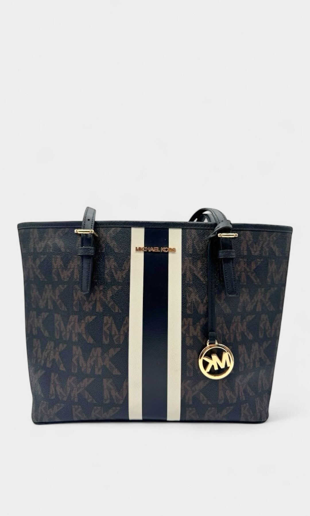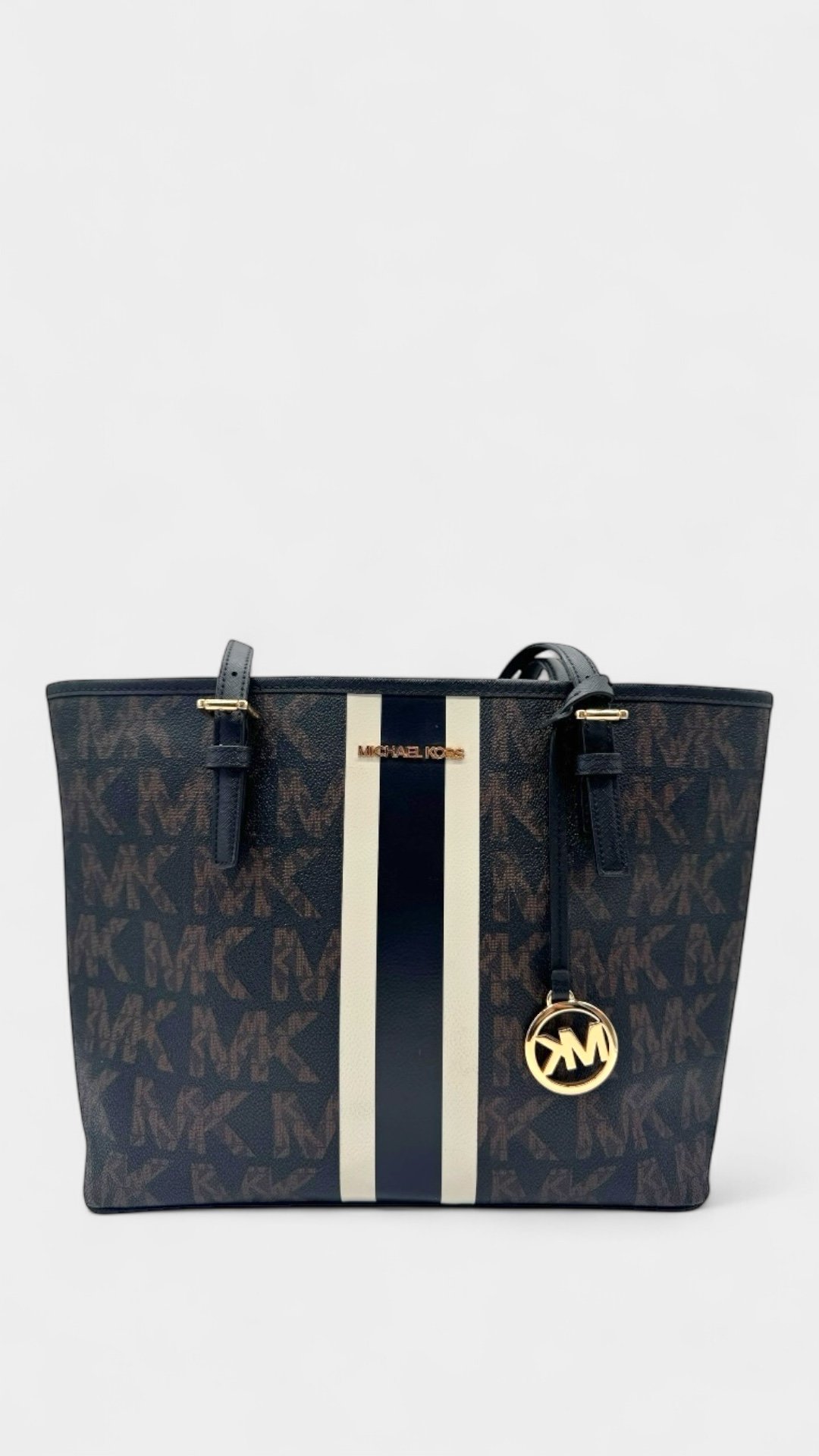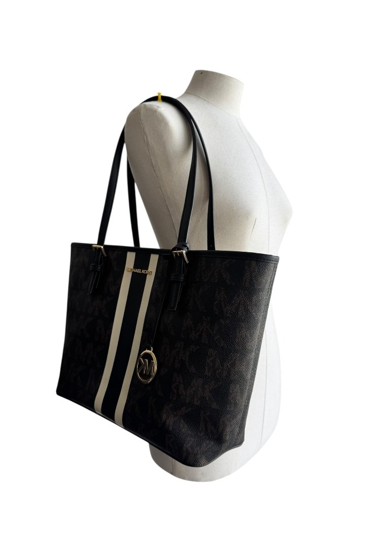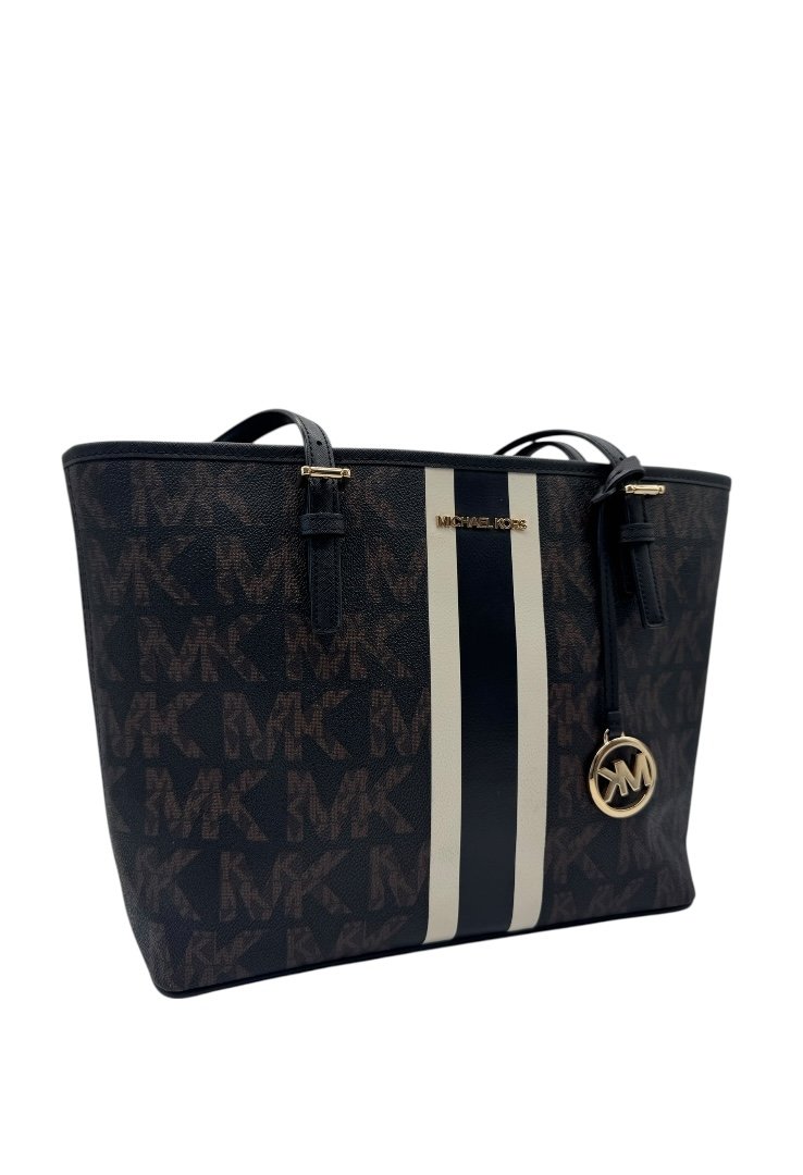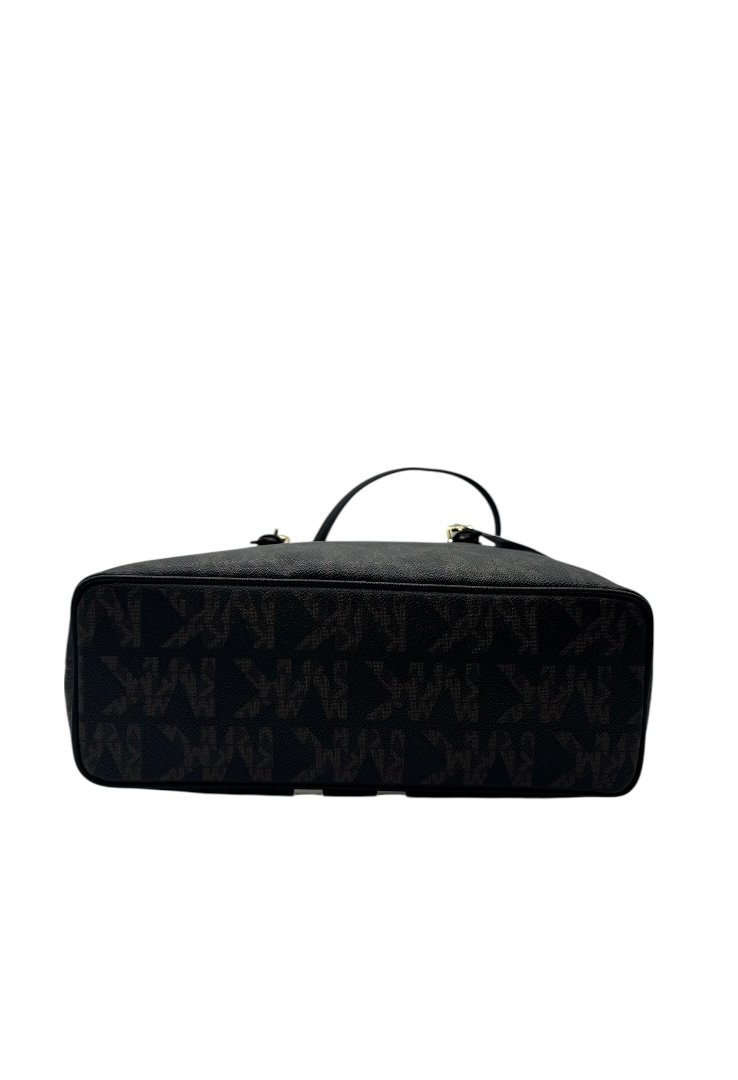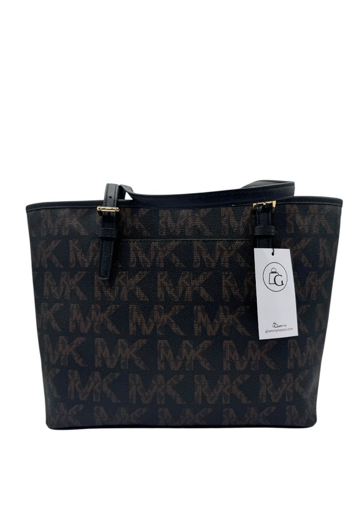 Bolso elaborado en lona con diseño monogram, apliques en dorado, asas al hombro, cierre principal con broche.
