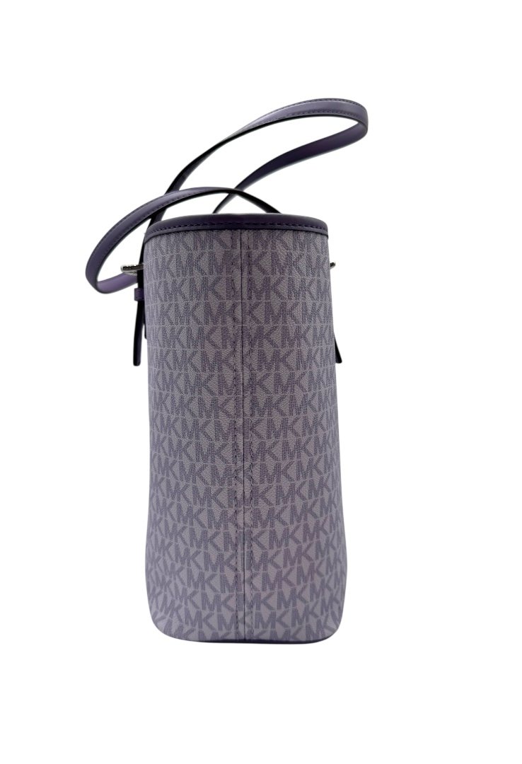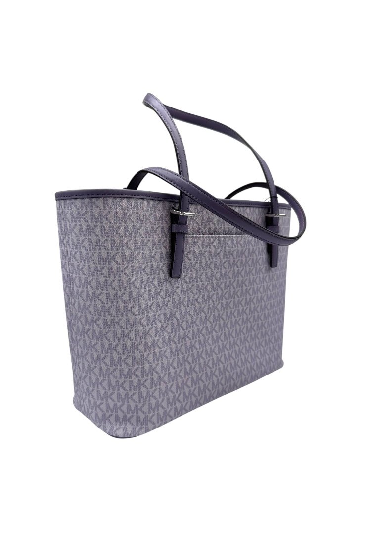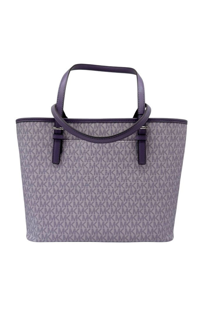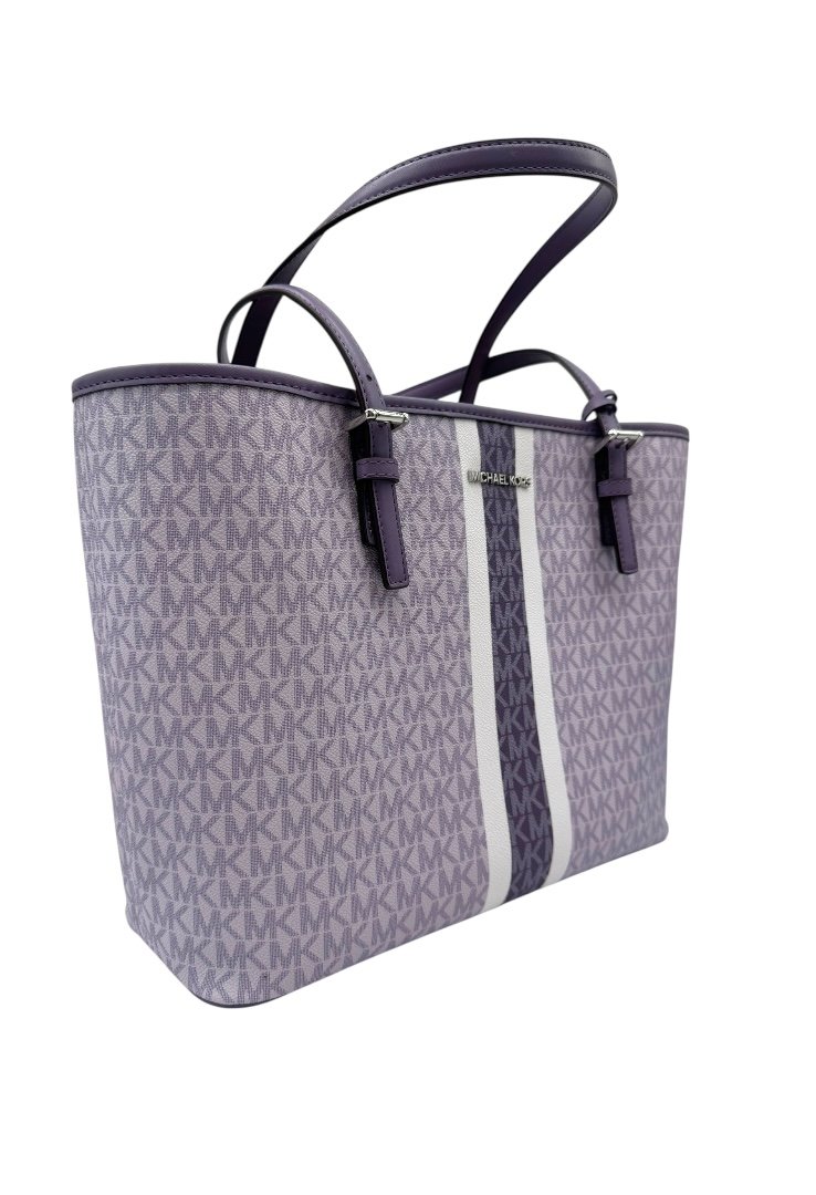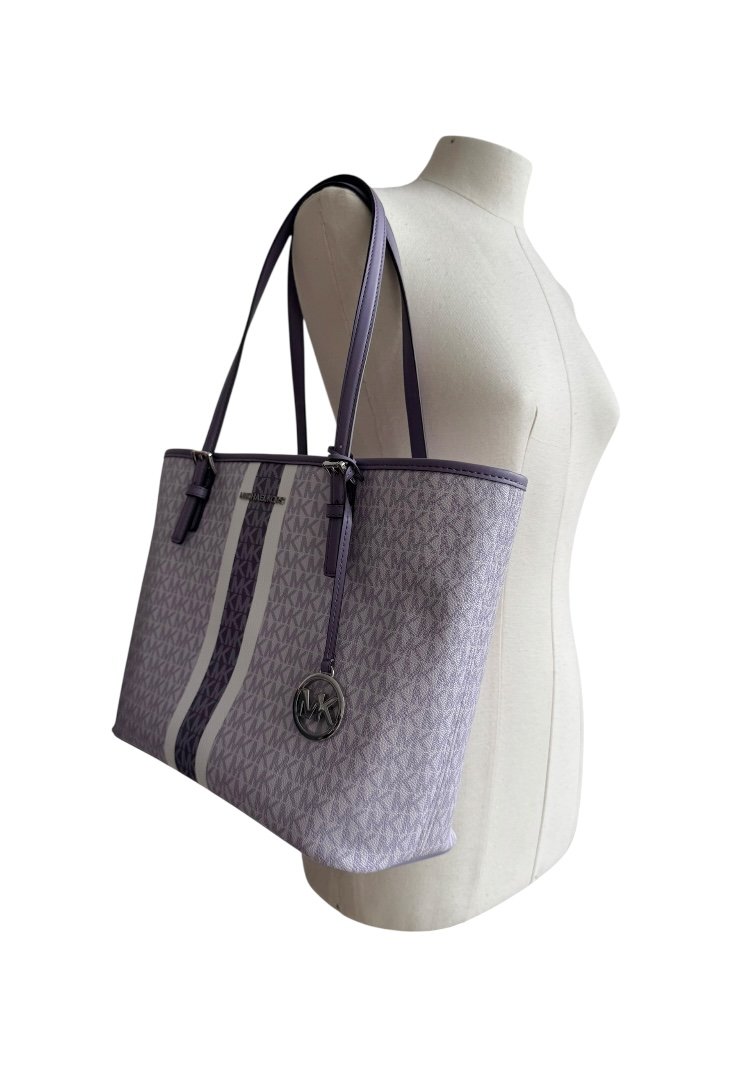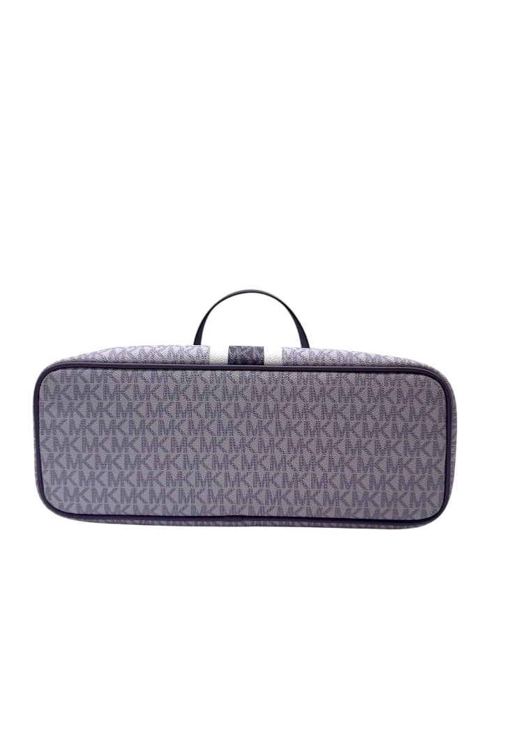 Bolso elaborado en lona diseño monogram y franjas, asas en cuero, apliques en plata, cierre con broche.