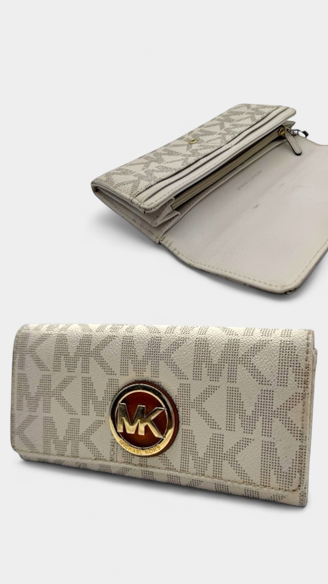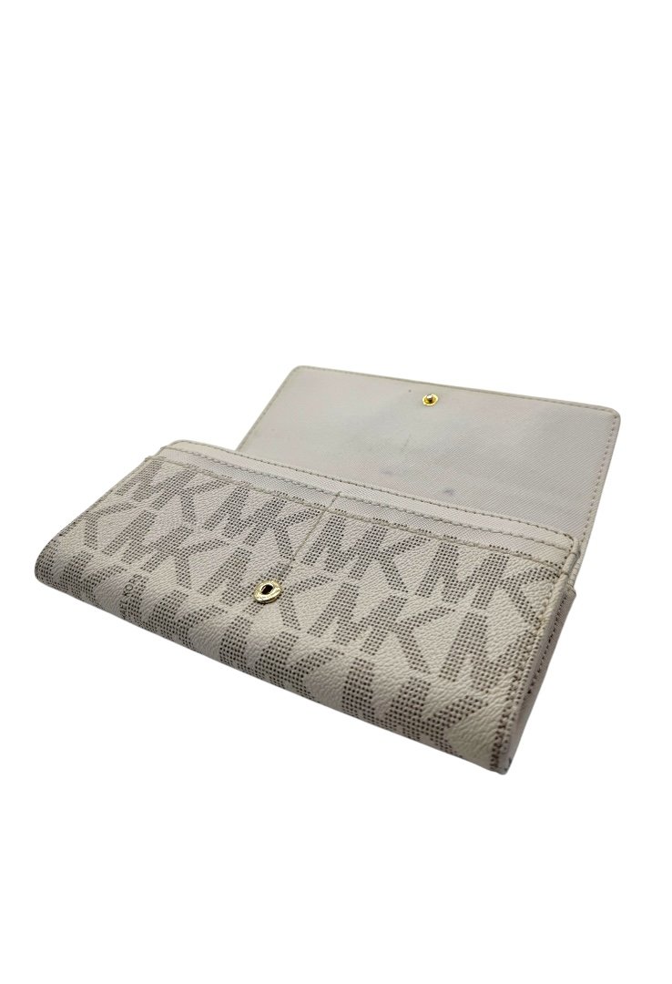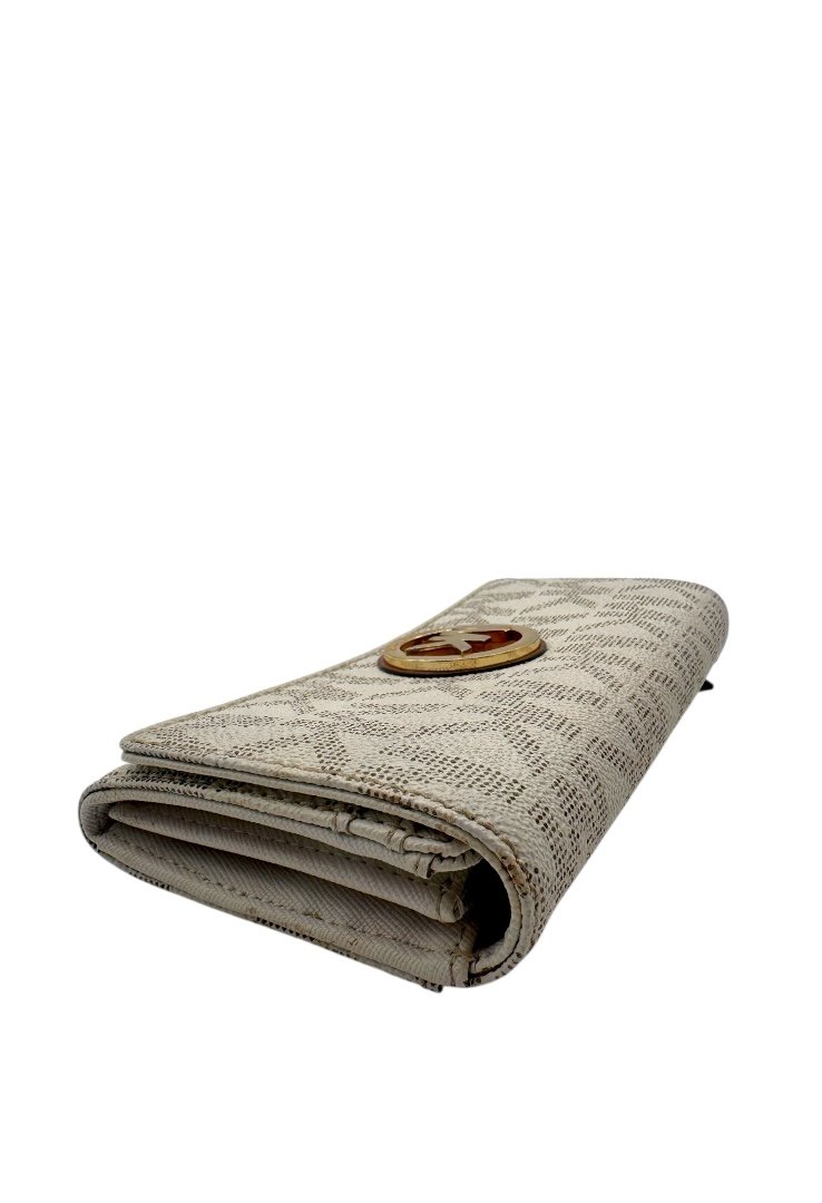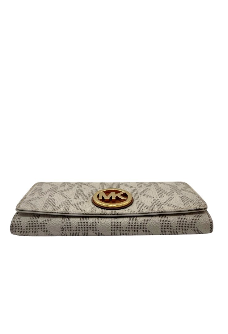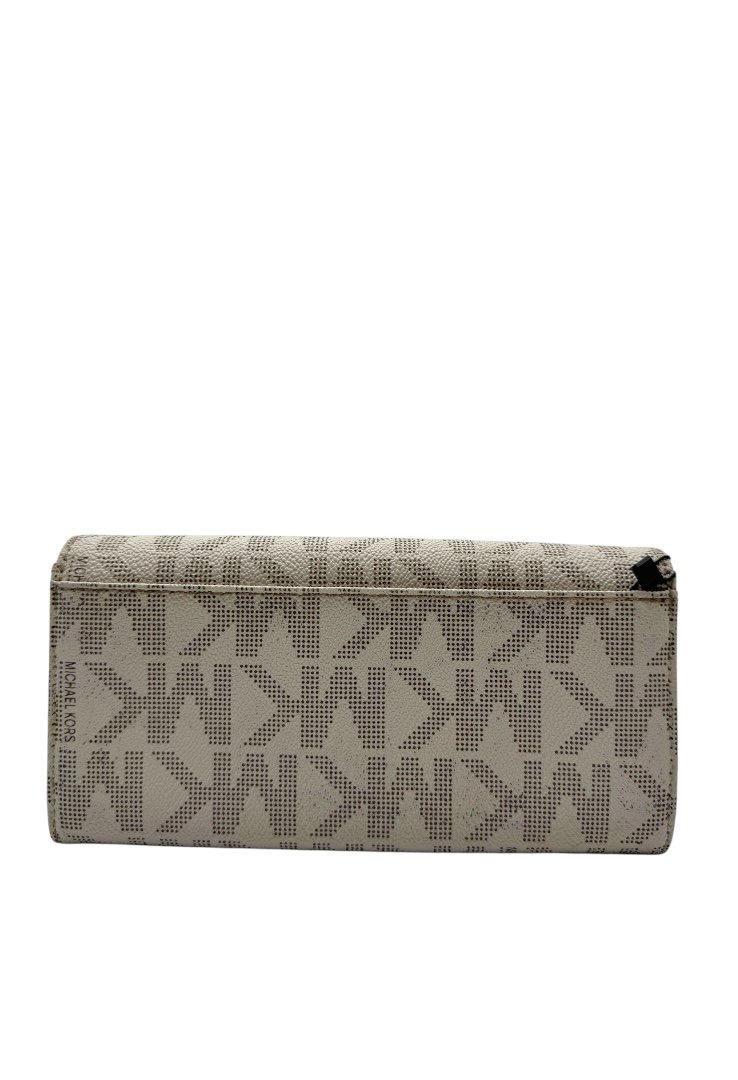 Cartera elaborada en lona con diseño monogram, con apliques en dorado.