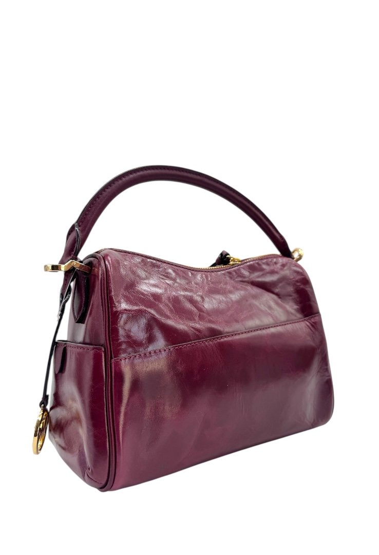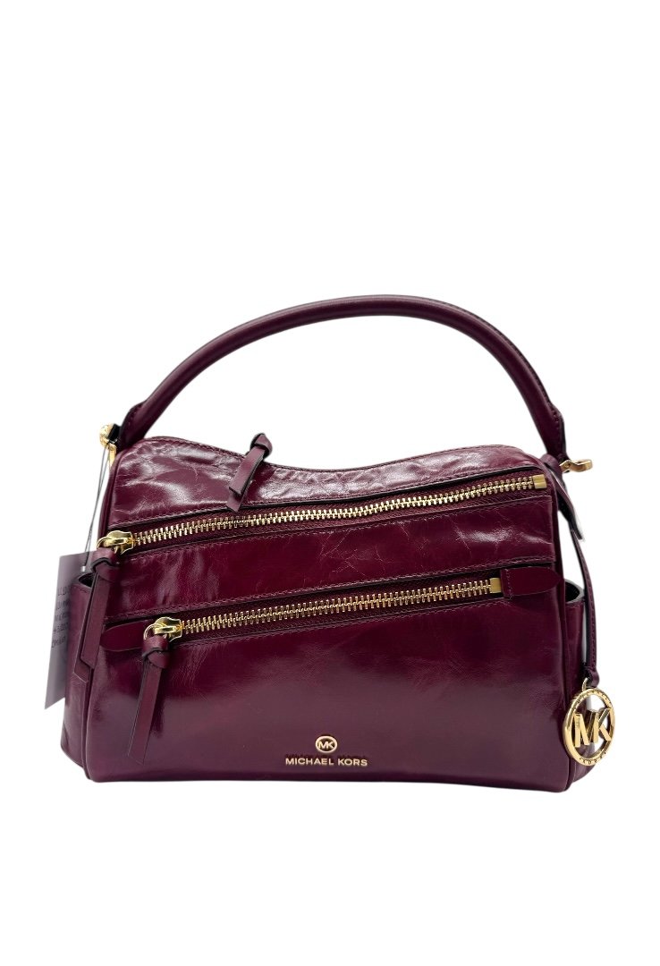 Bolsa elaborada en cuero, apliques en dorado, detalles de zipper en la parte frontal, compartimento principal con zipper.