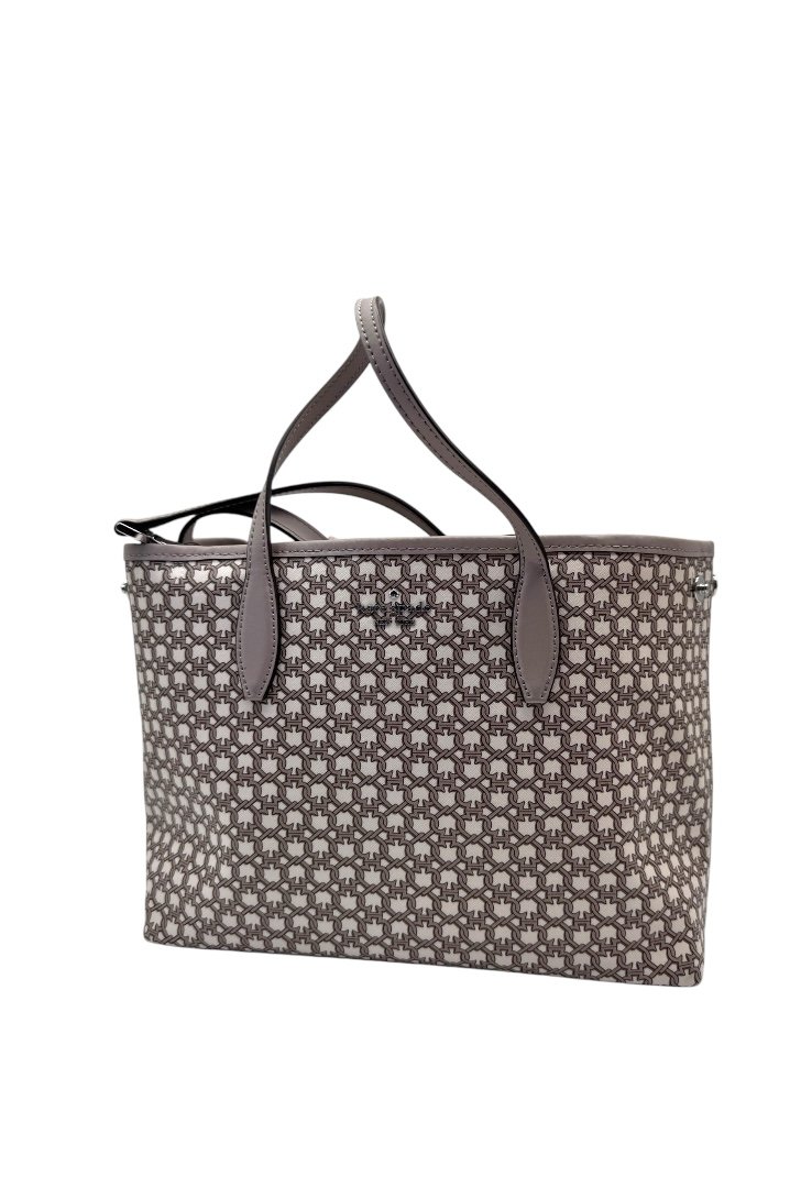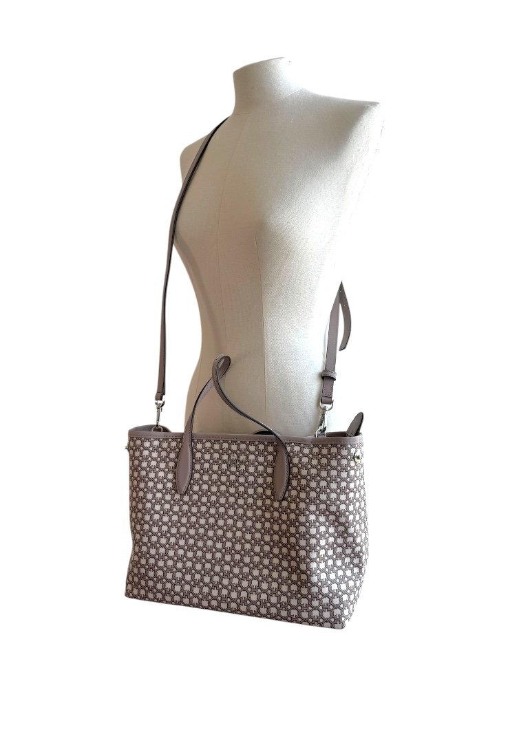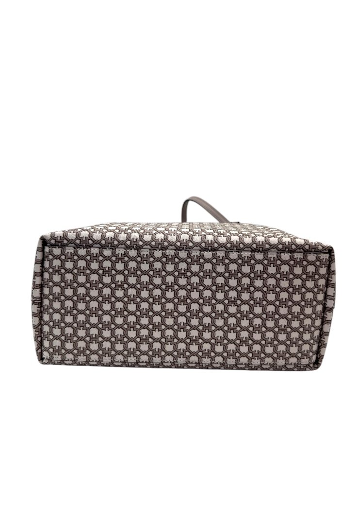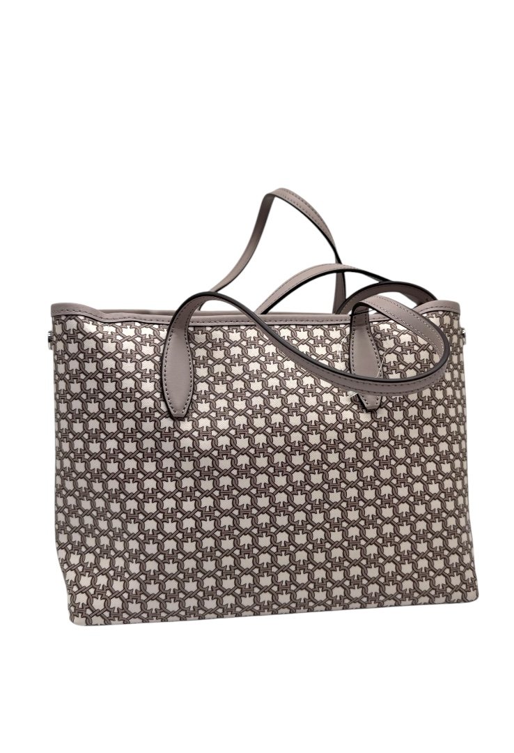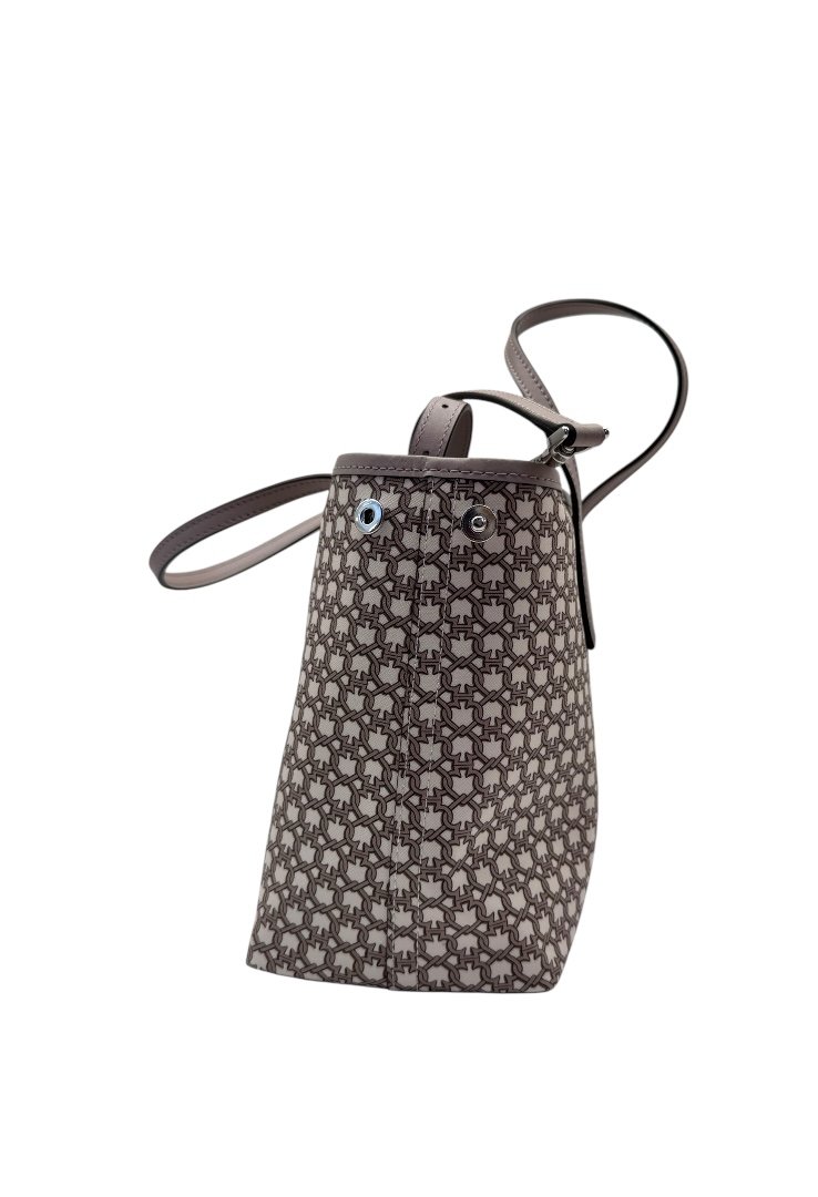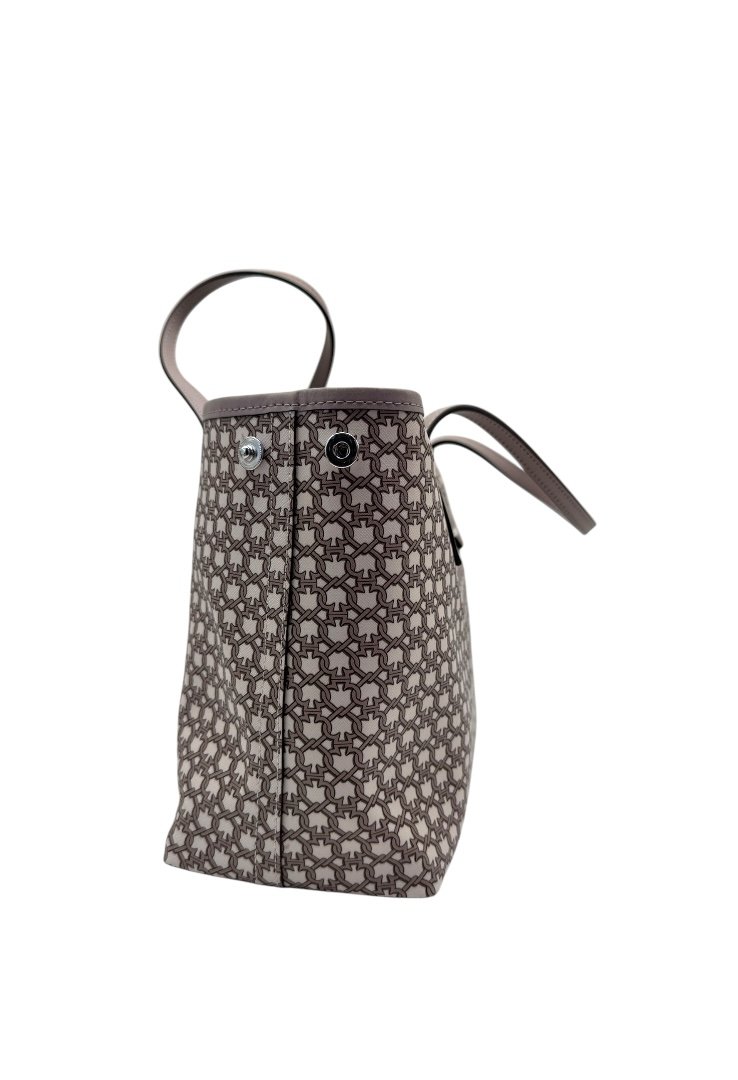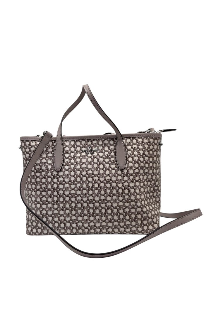 Bolsa fabricada en lona, con print simétrico, herrajes en plata, asa ajustable.