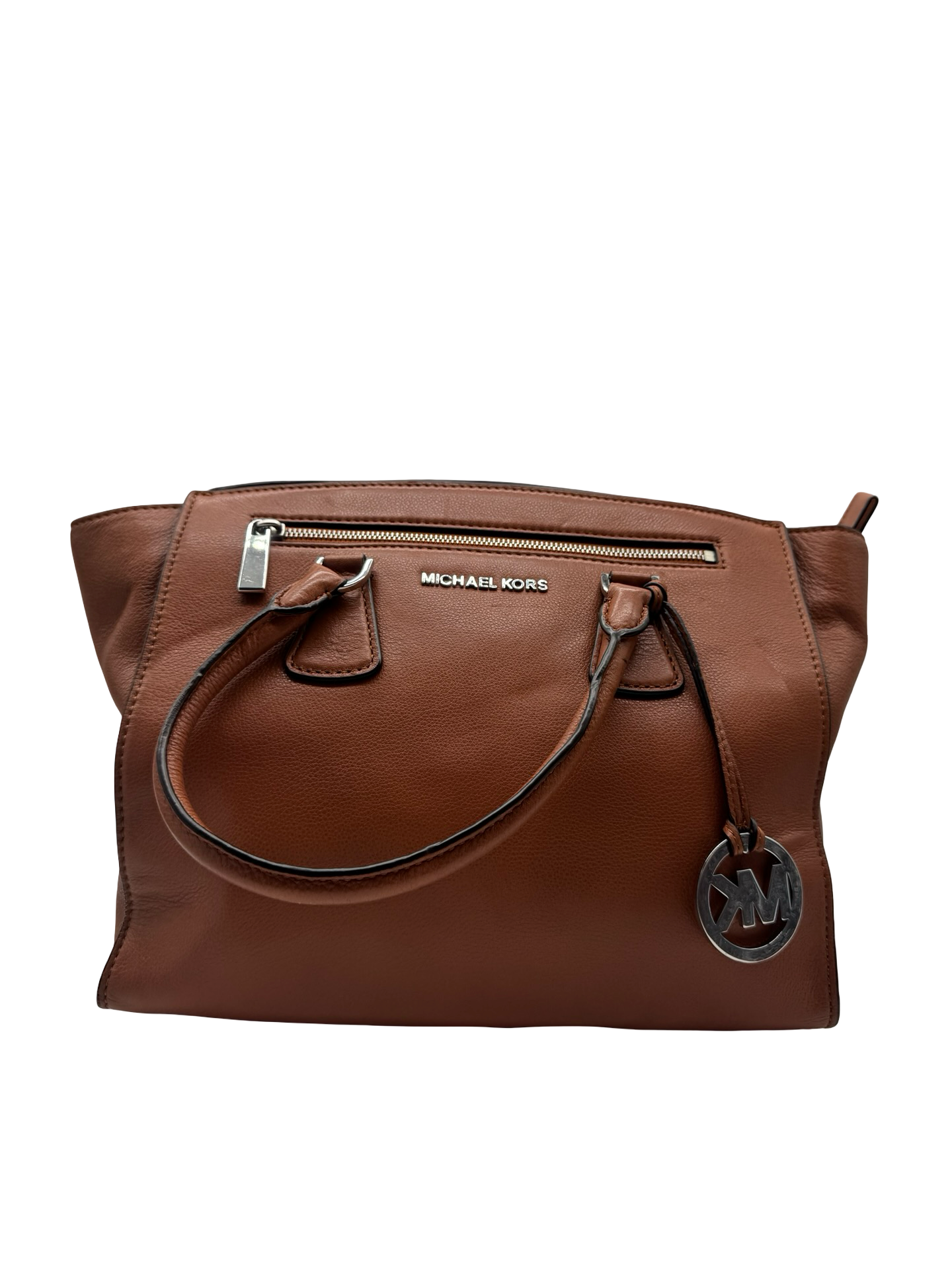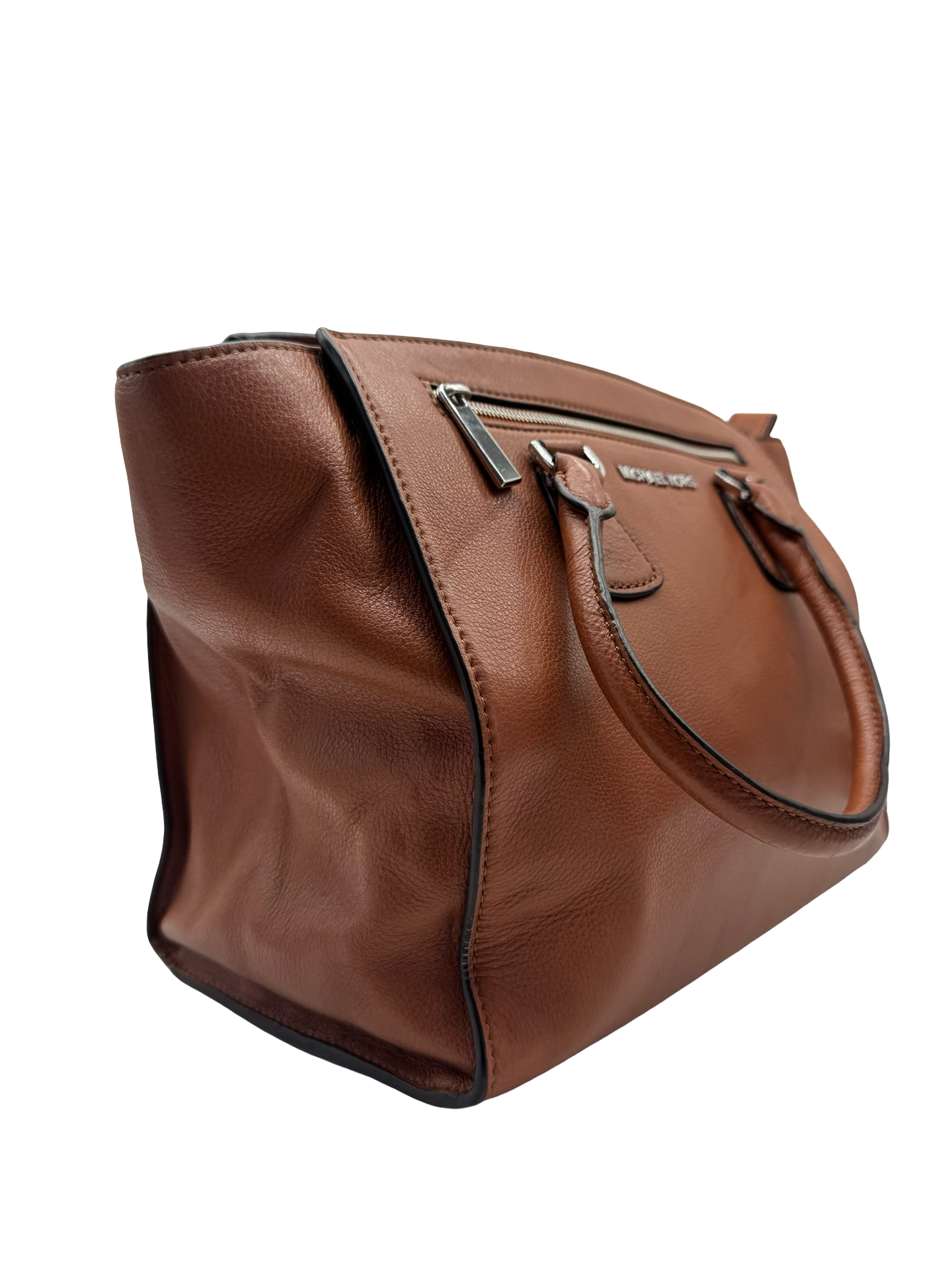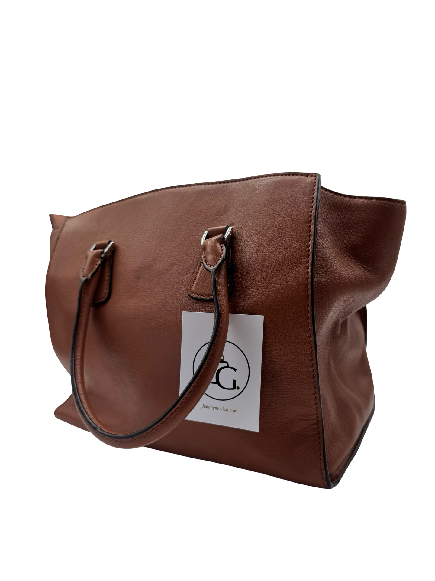 Bolsa elaborada en piel granulada con apliques en plata, compartimento principal y exterior con cremallera.