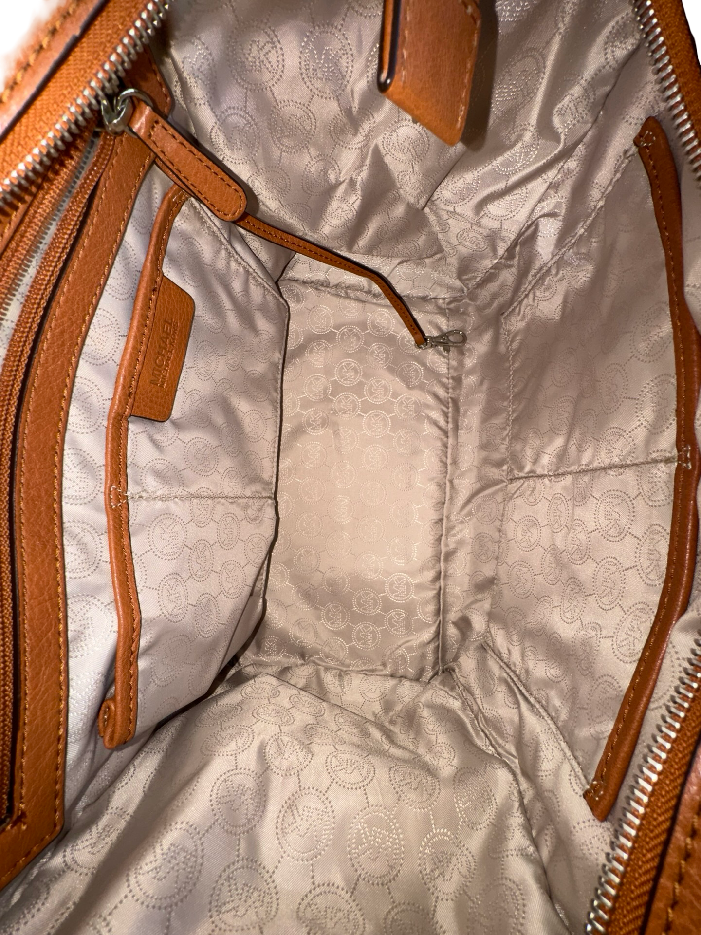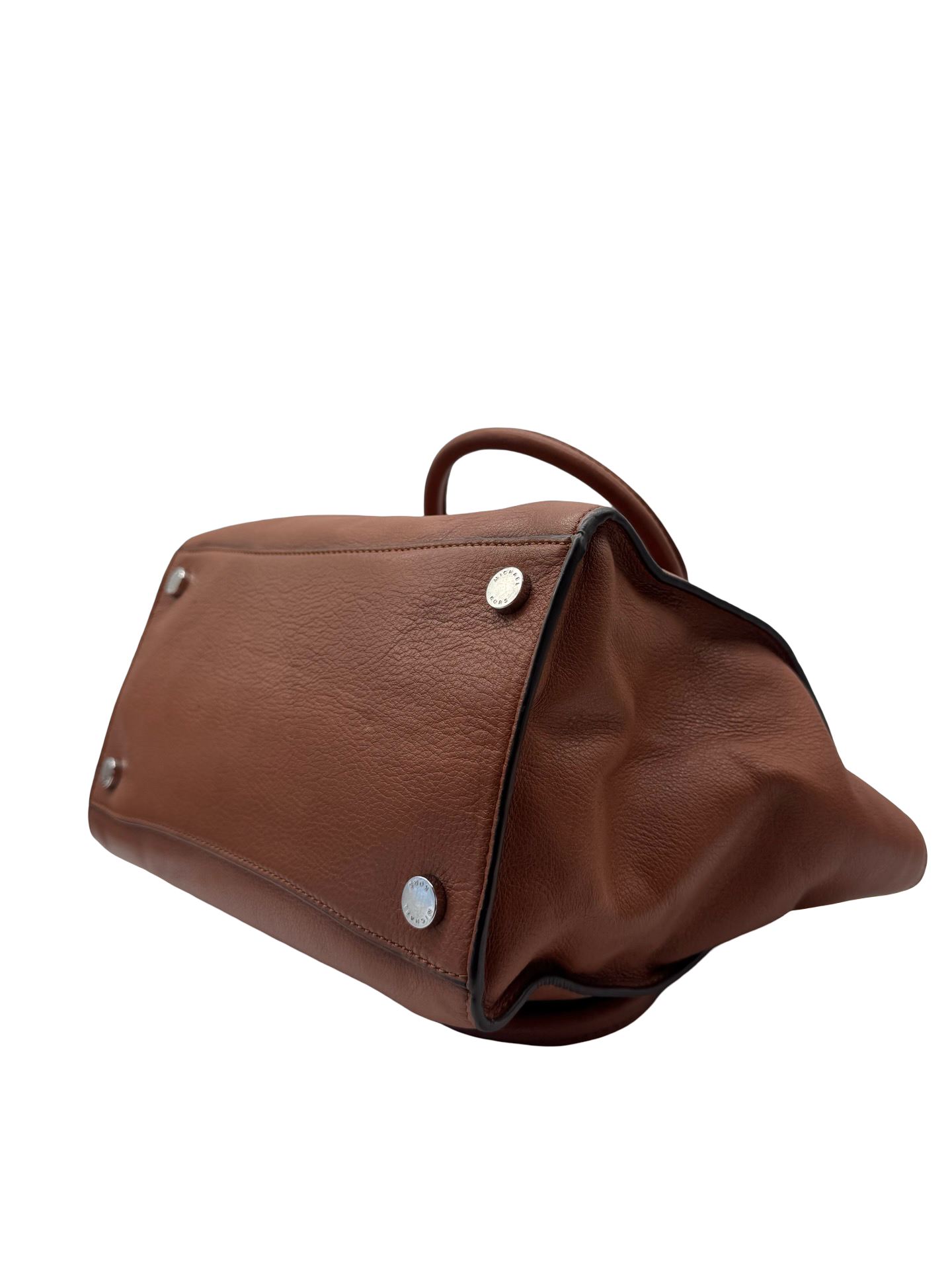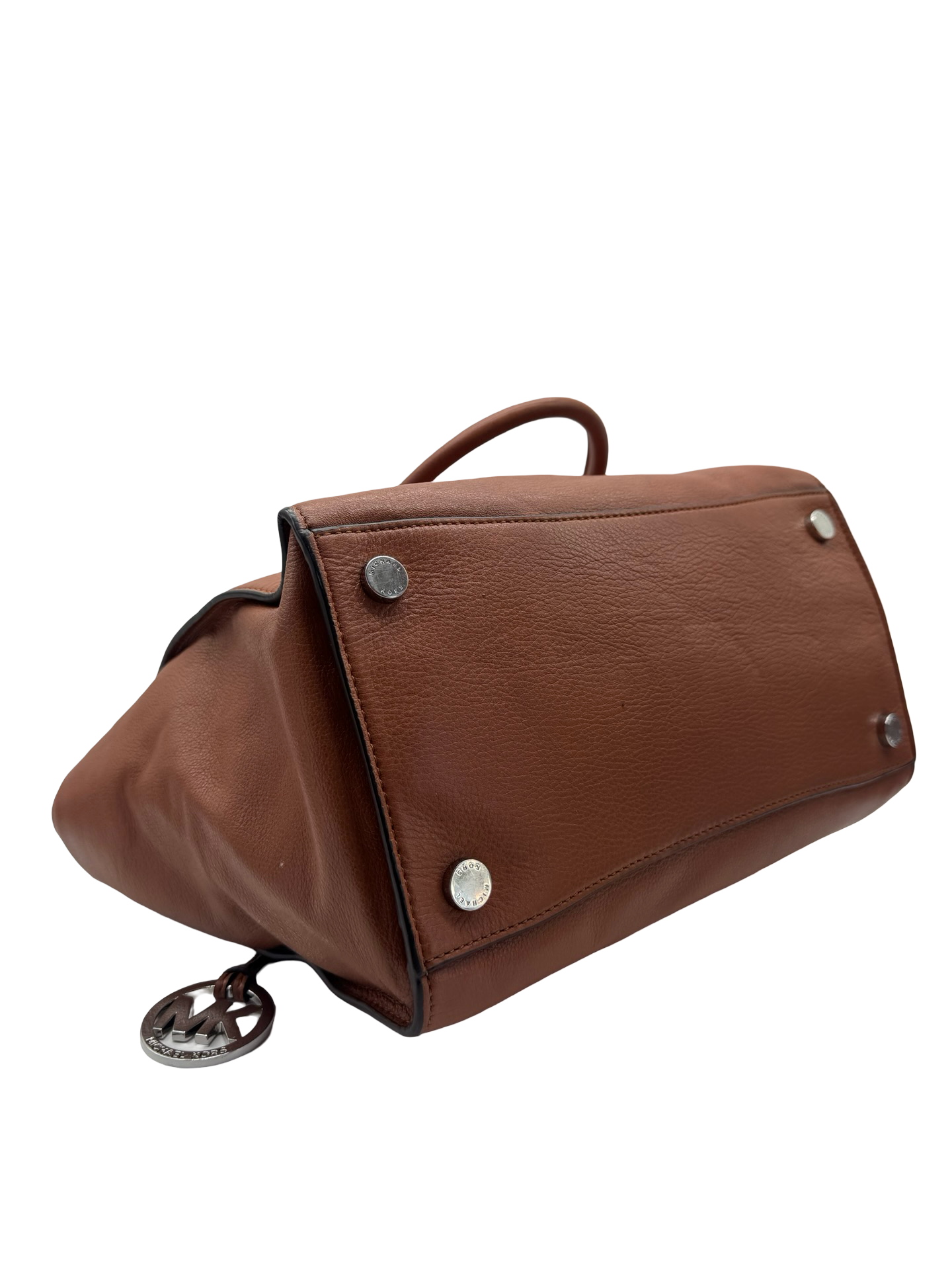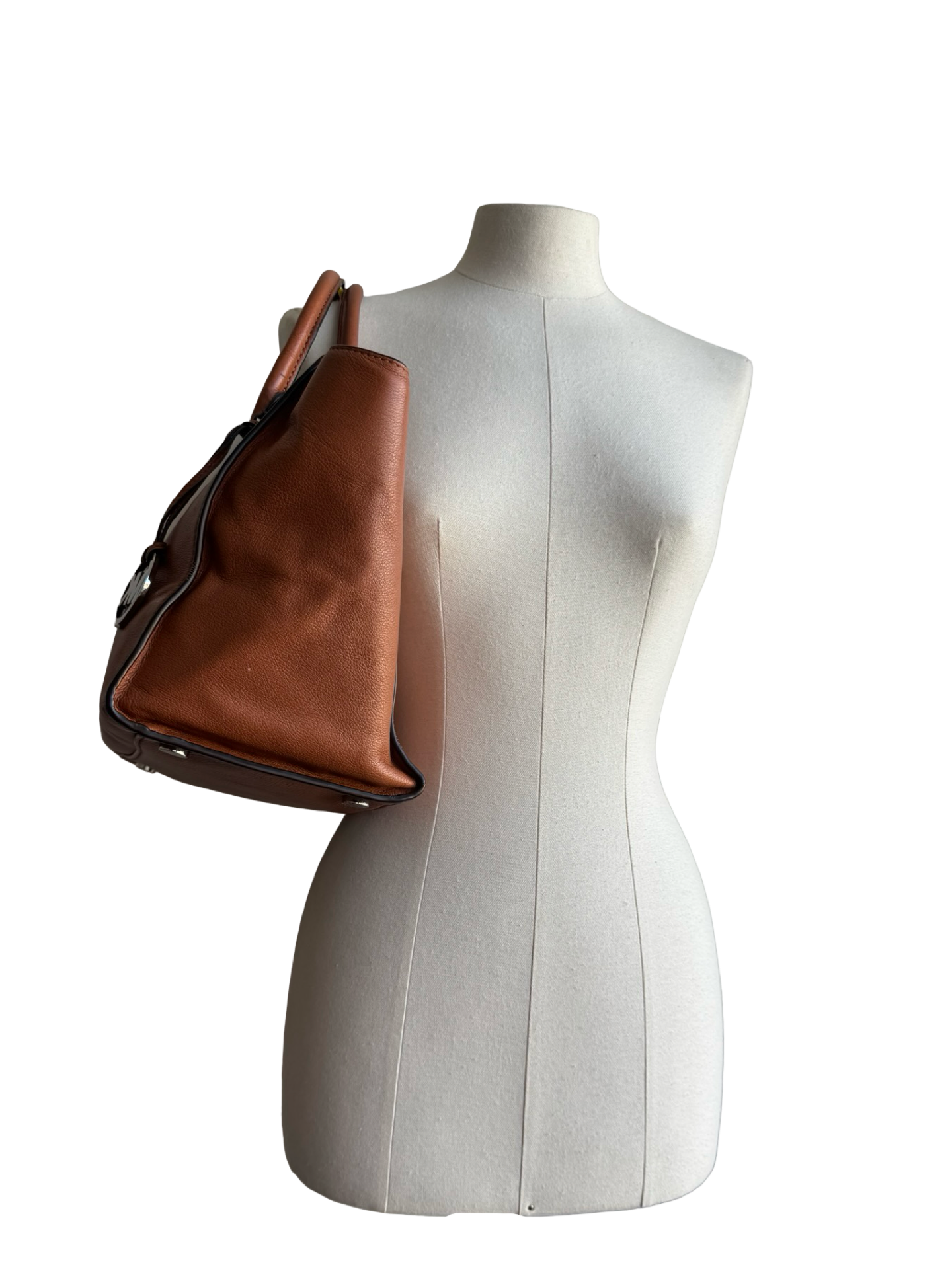 Bolsa elaborada en piel granulada con apliques en plata, compartimento principal y exterior con cremallera.