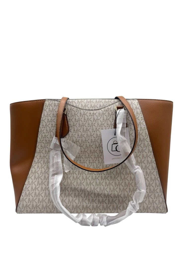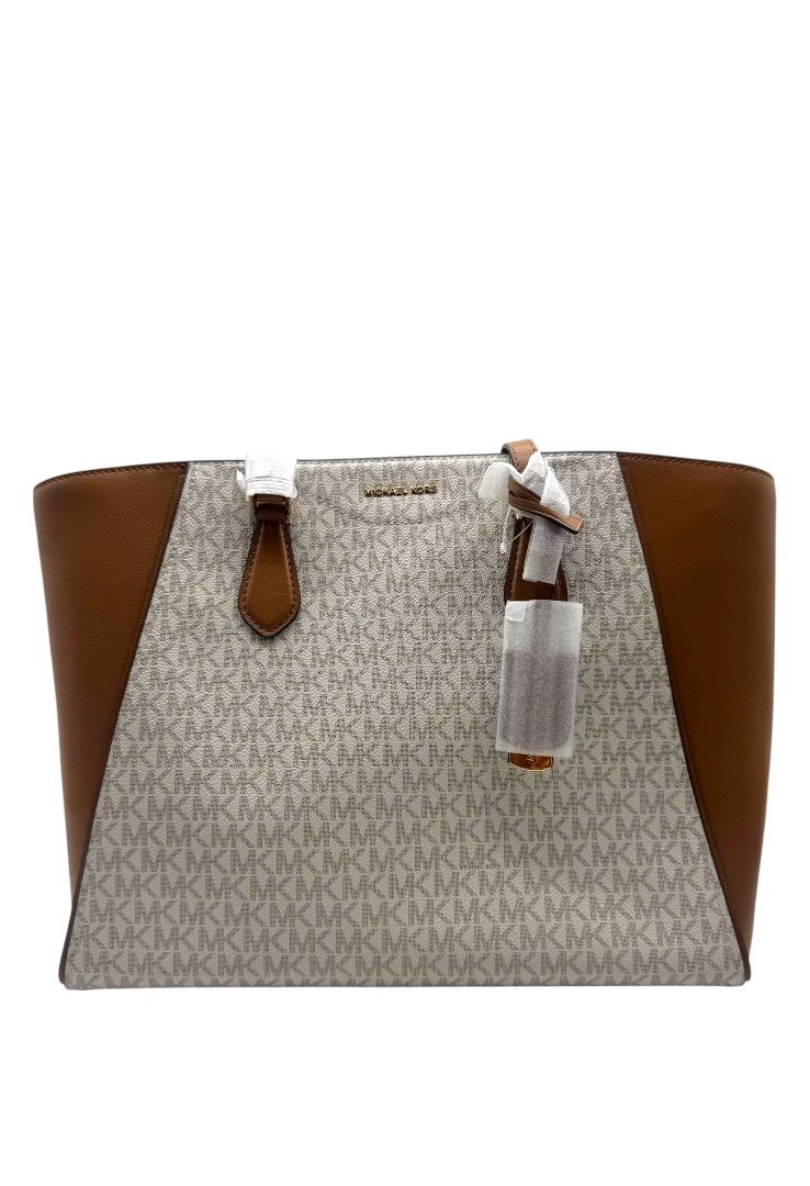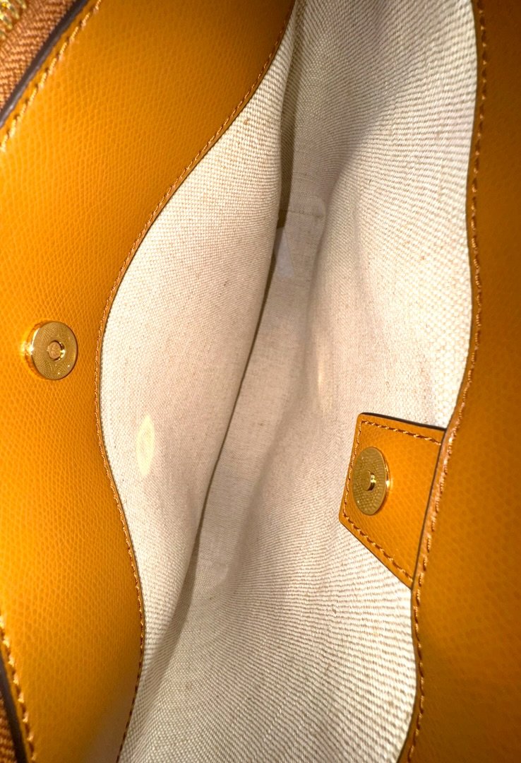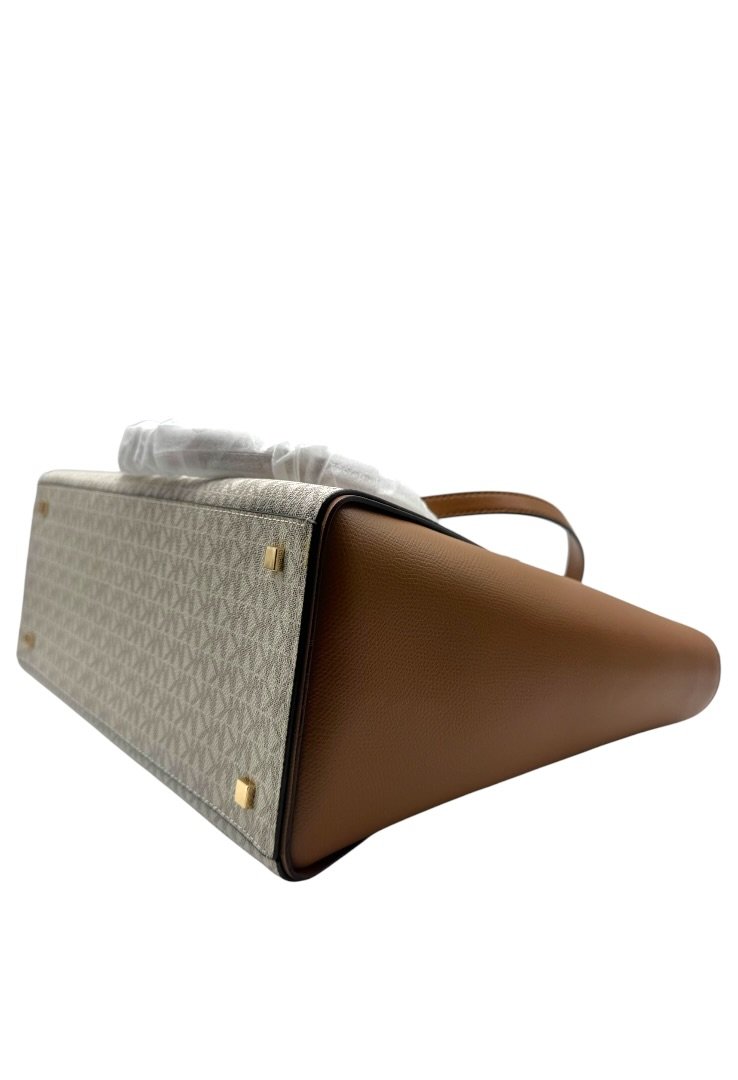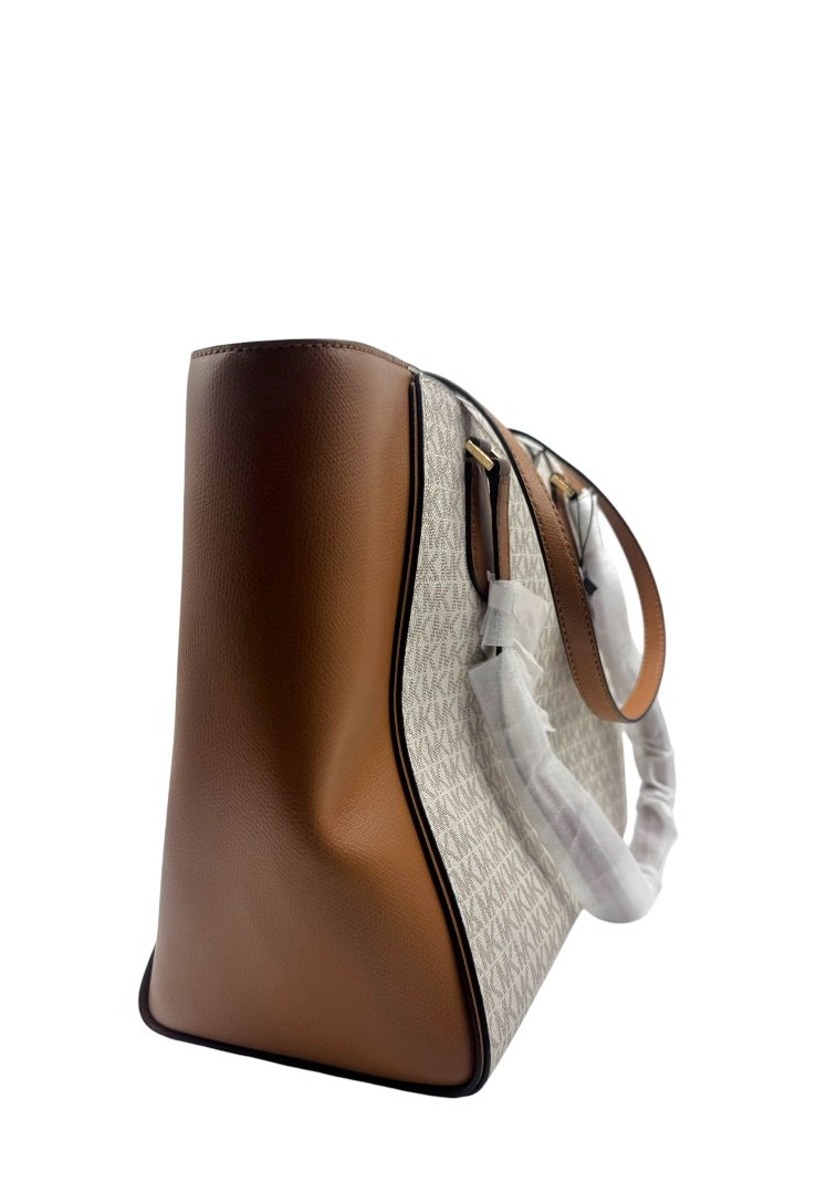 Bolso elaborado en lona con diseño monogram, asa y esquinas en cuero, herrajes en dorado, compartimento principal con cremallera.