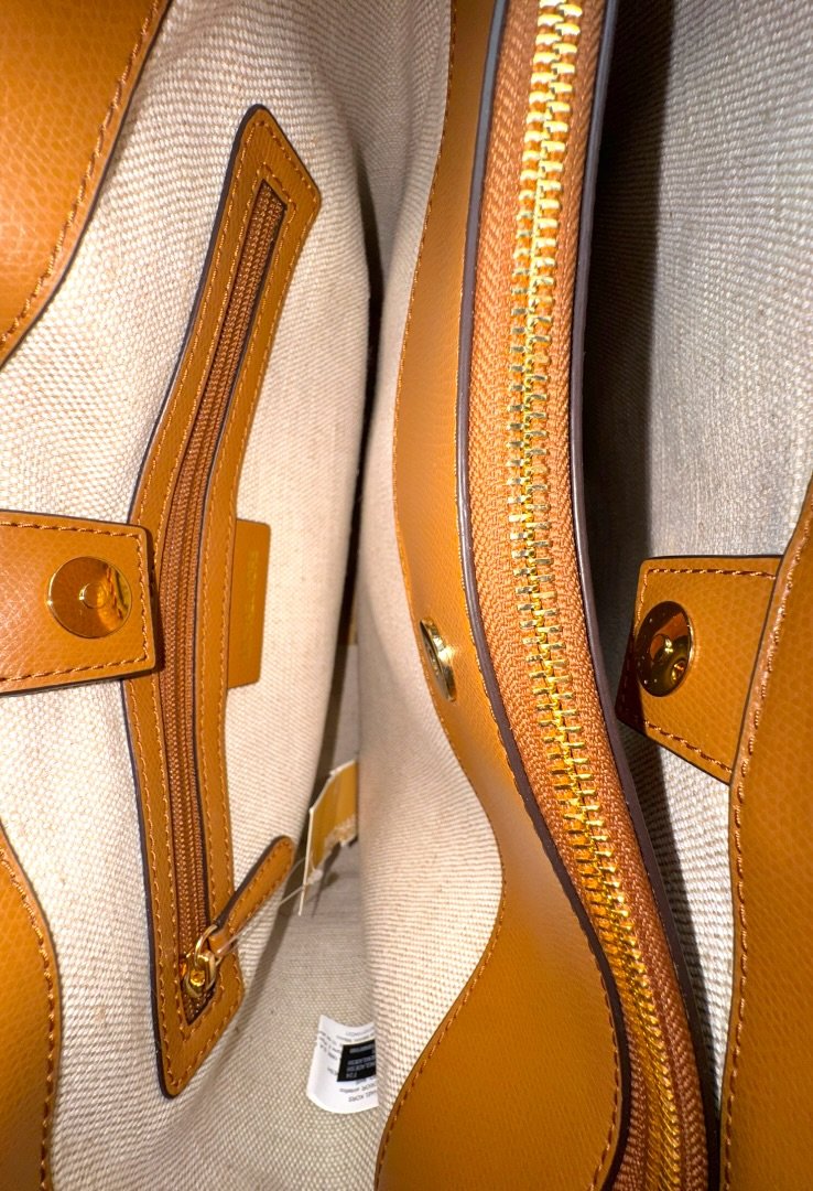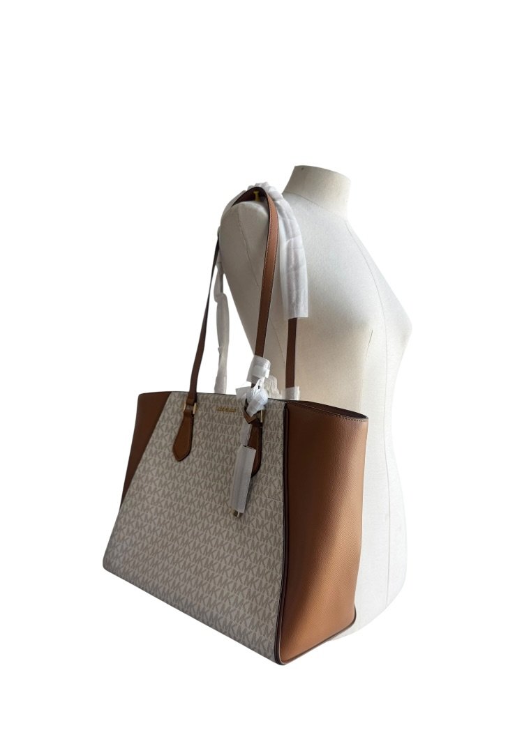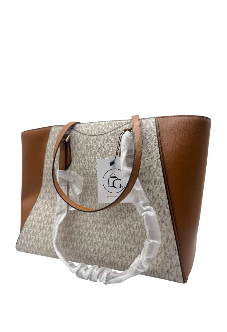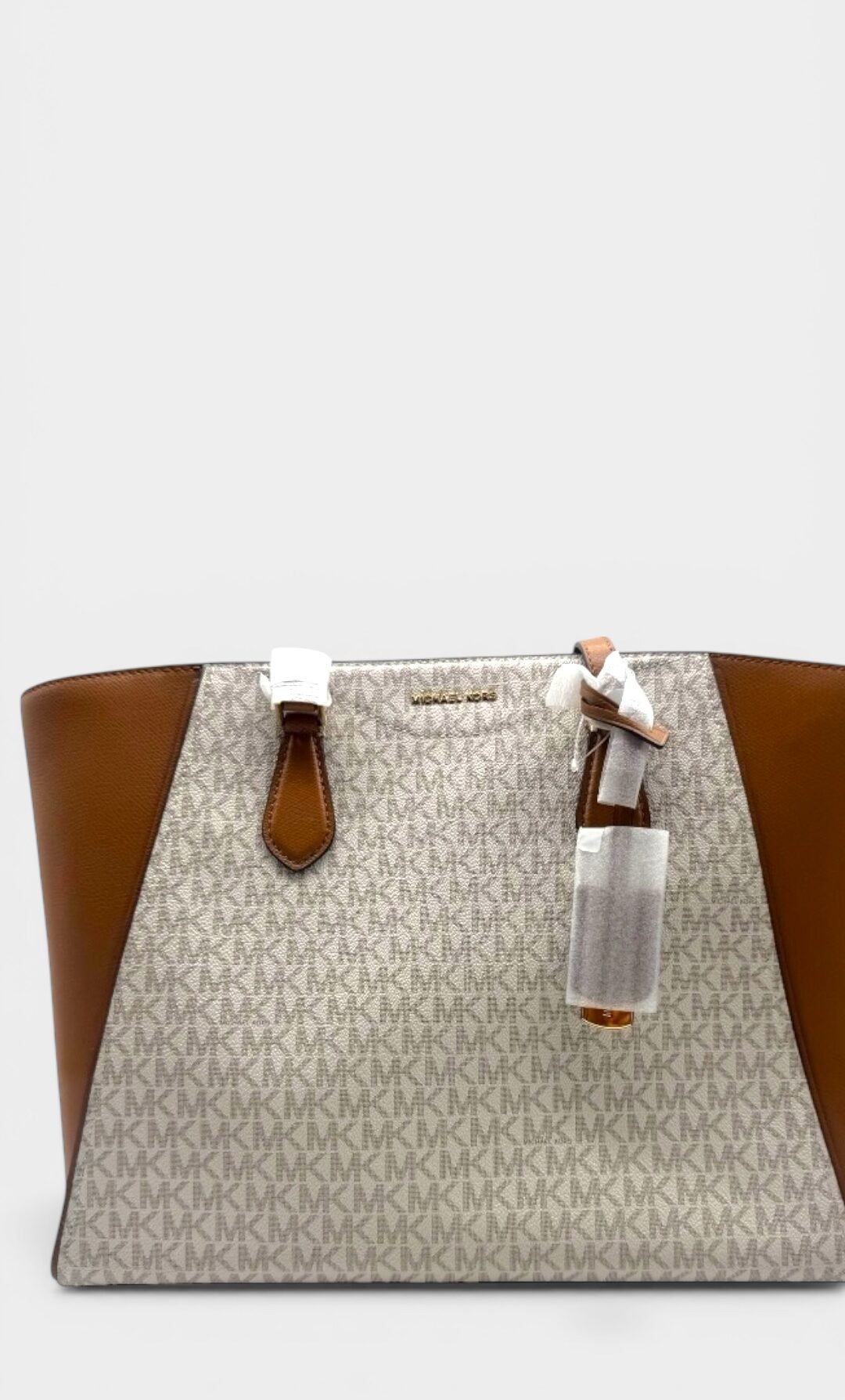 Bolso elaborado en lona con diseño monogram, asa y esquinas en cuero, herrajes en dorado, compartimento principal con cremallera.