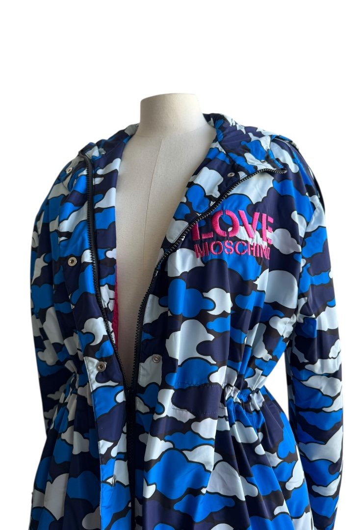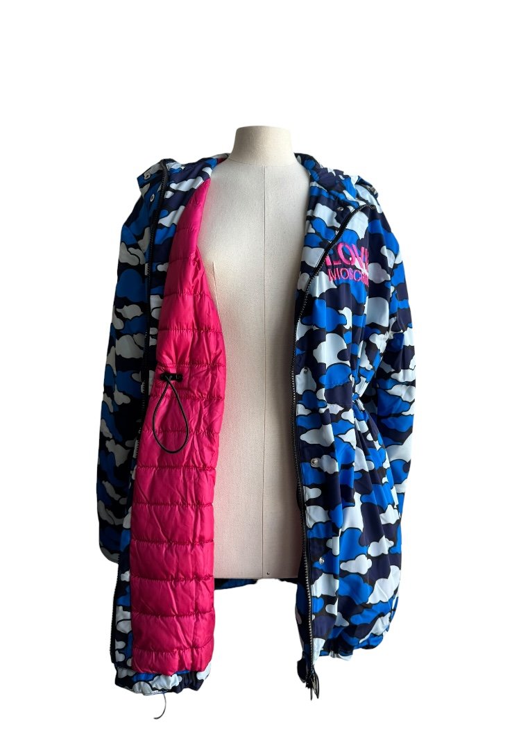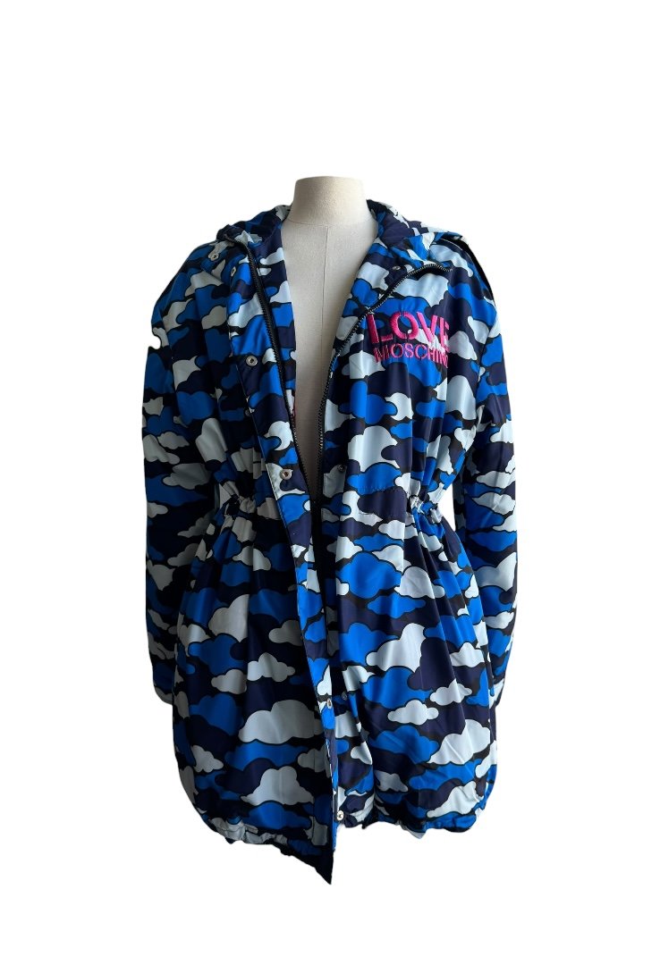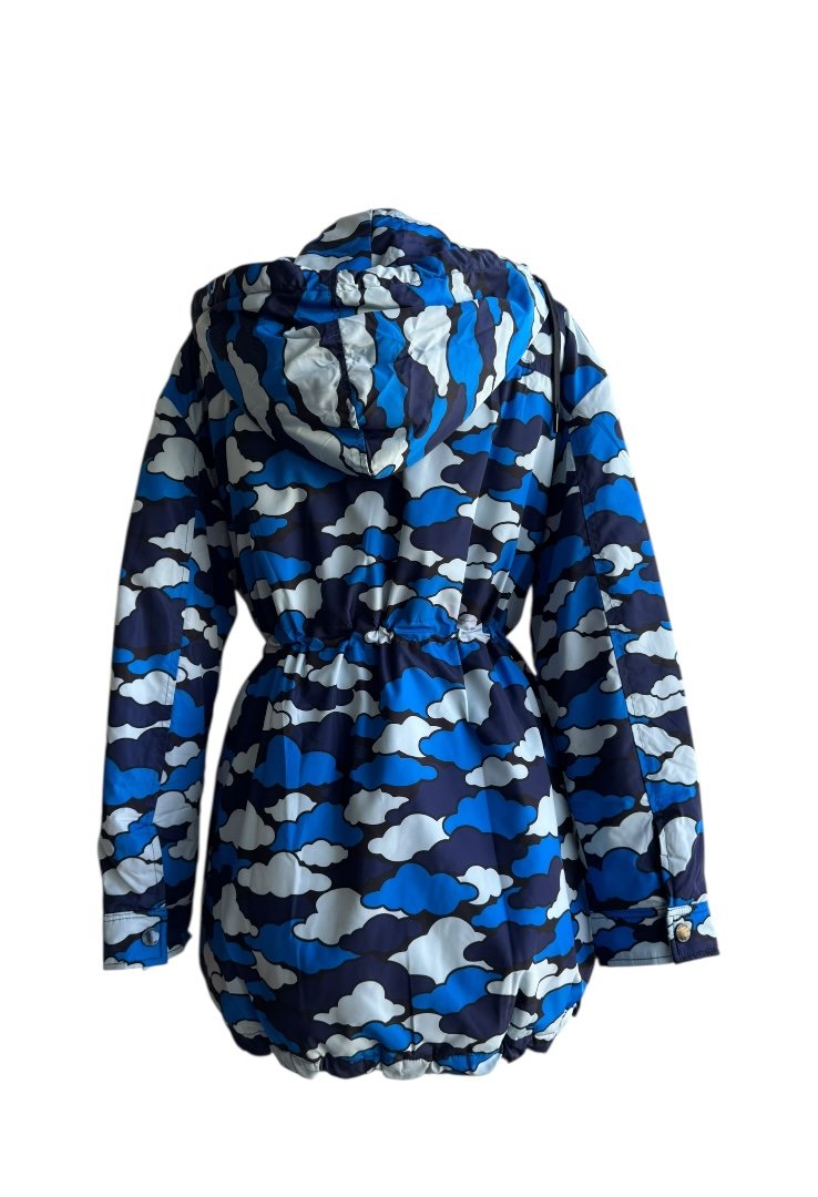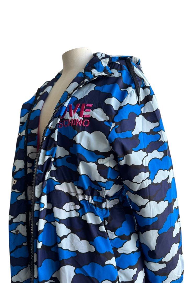 Chamarra elaborada en poliester, con print de nubes, interior rosa.
