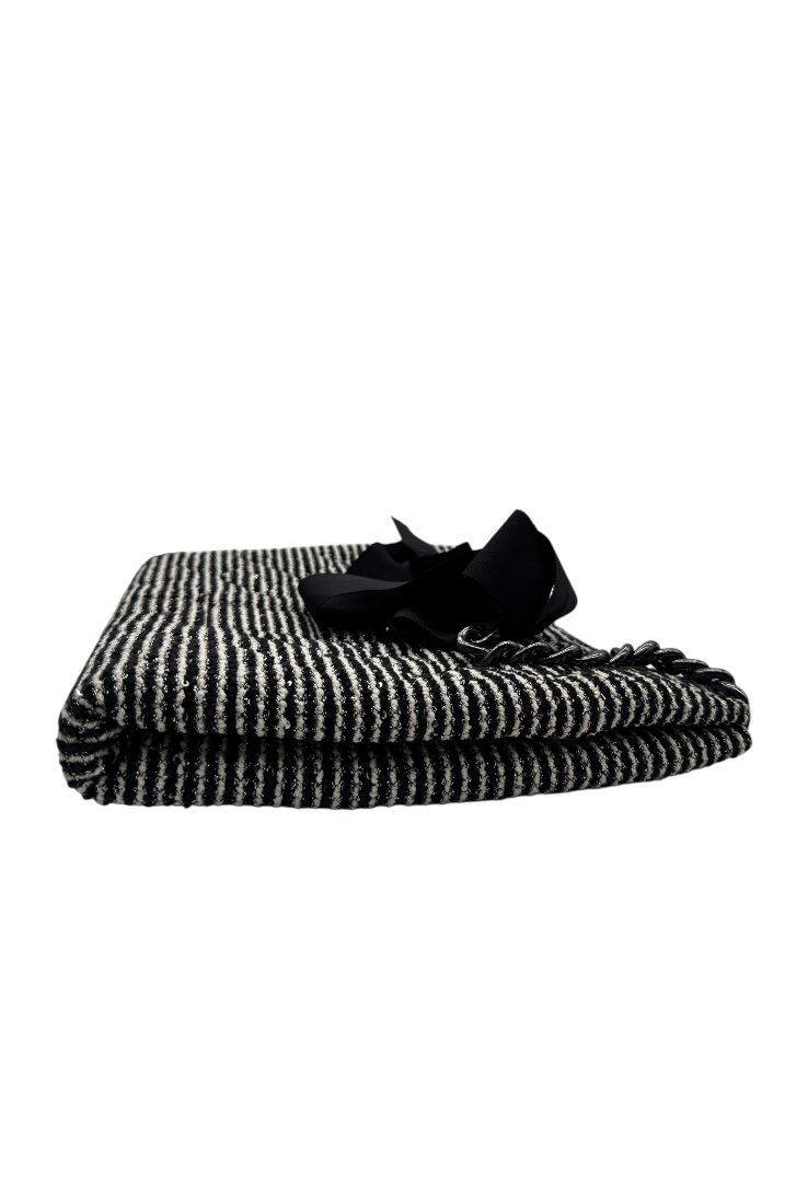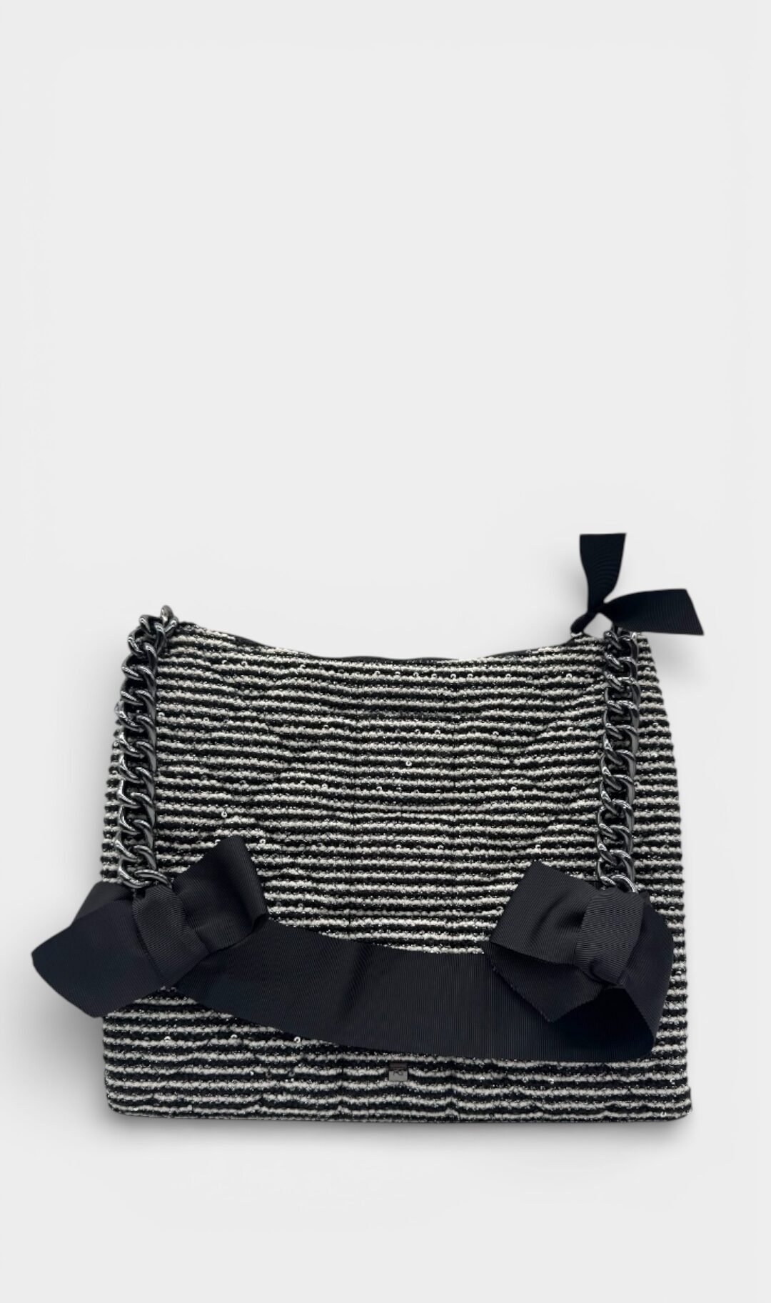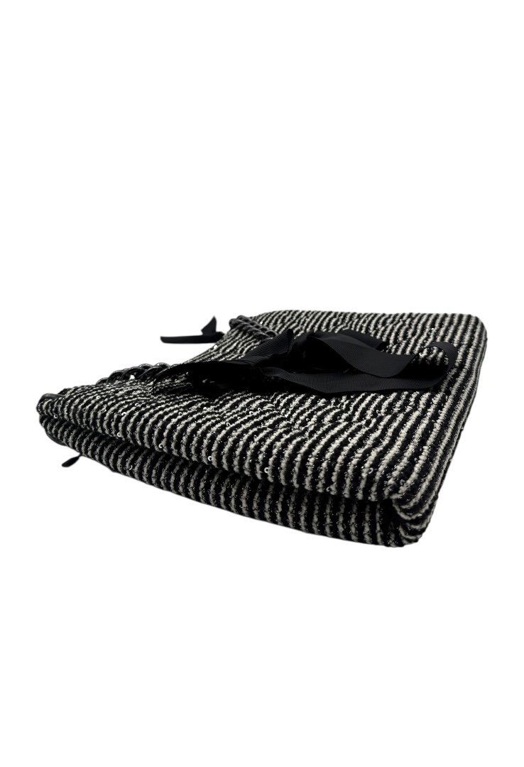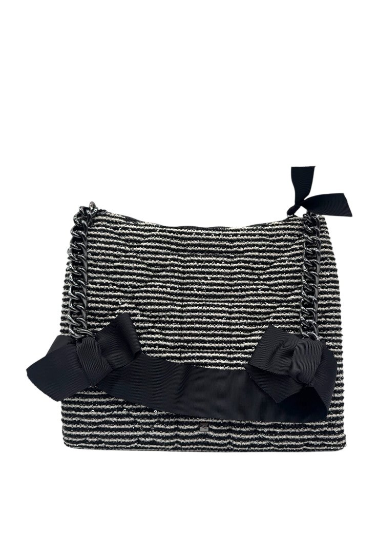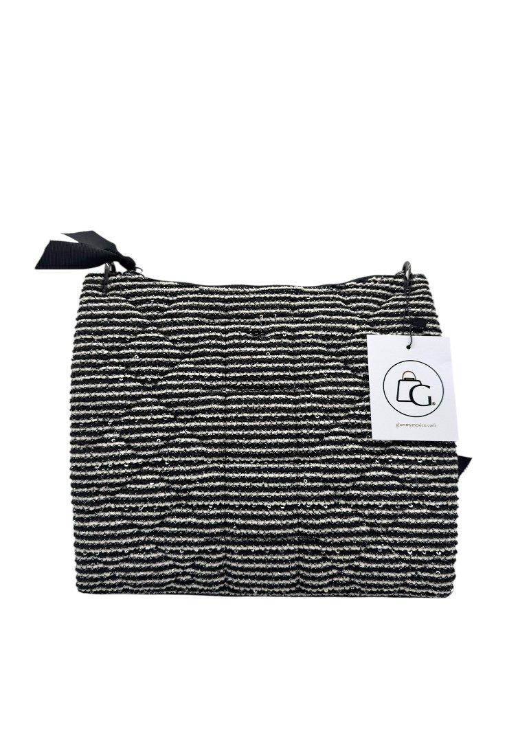 Bolsa elaborada en tweed, apliques en negro, detalle de moños en el asa, compartimento principal con zipper.