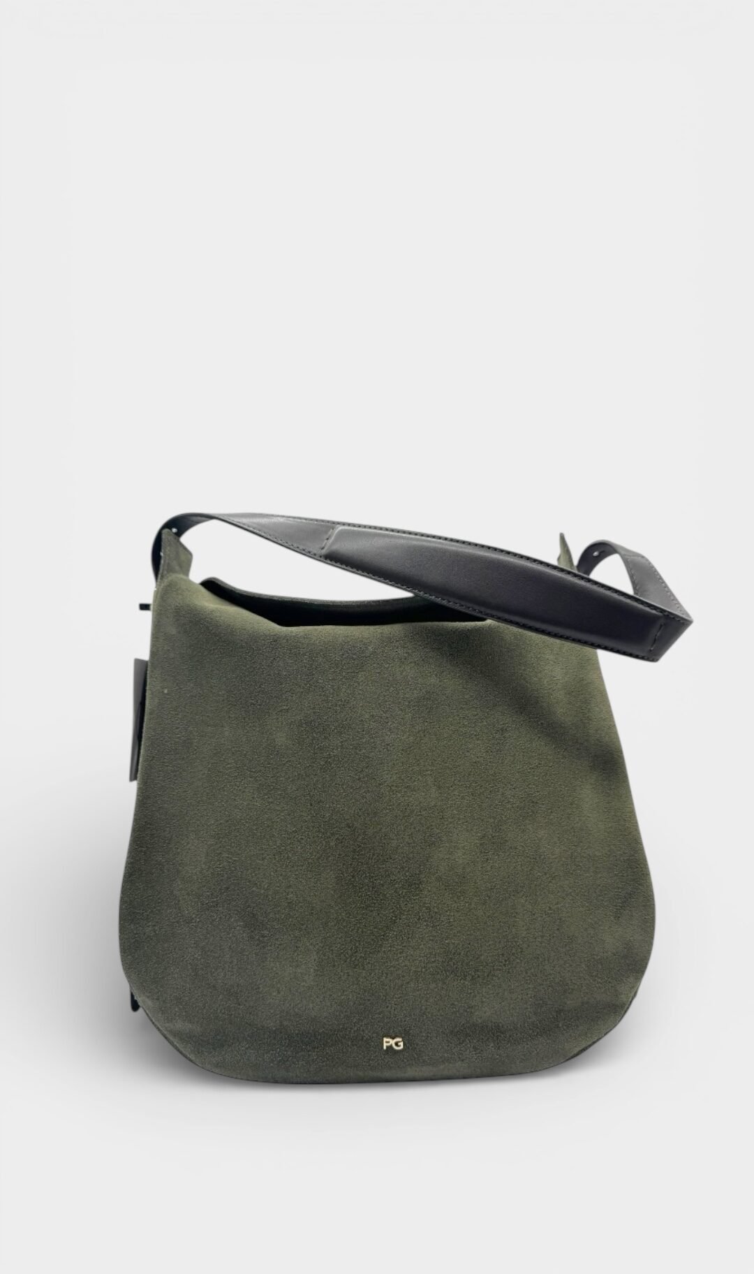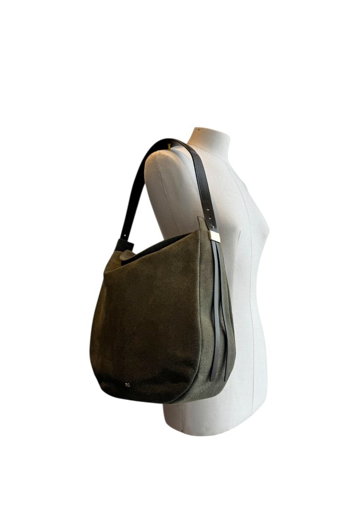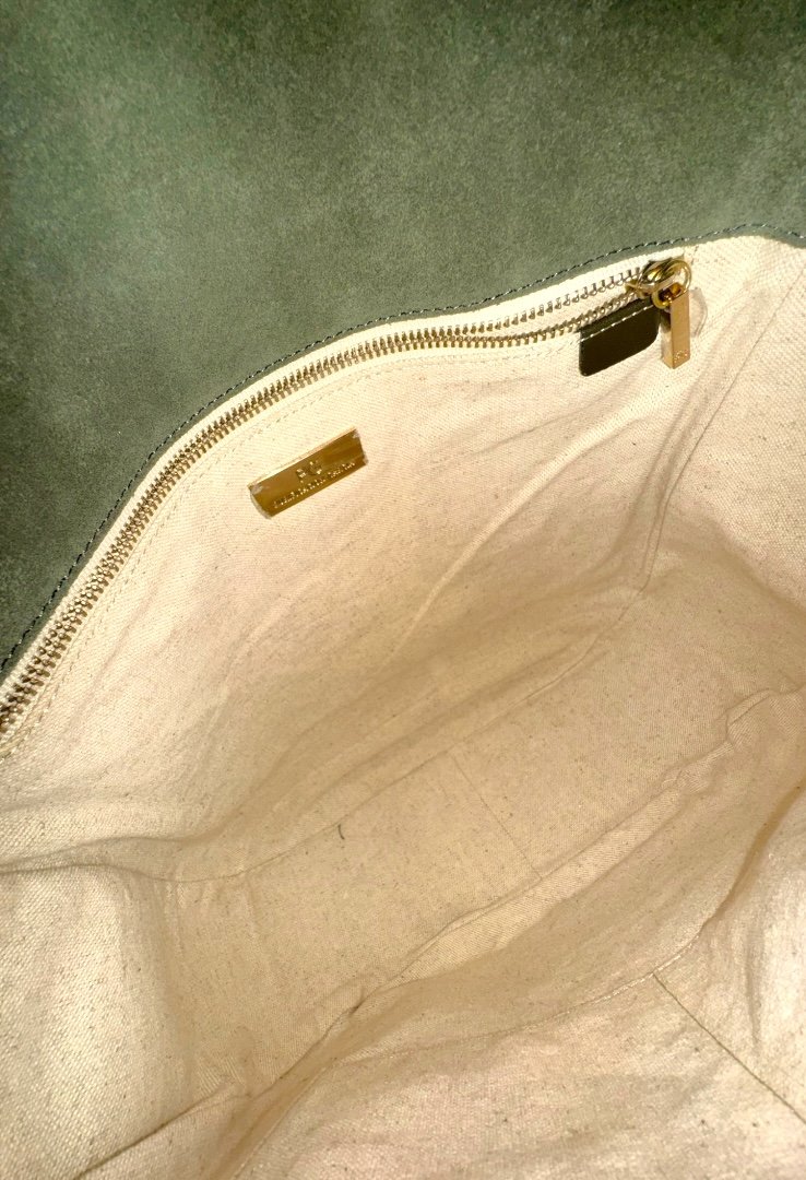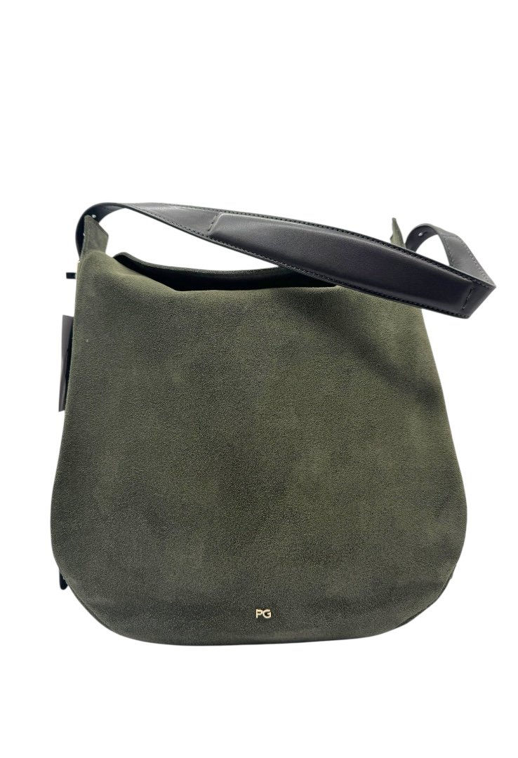 Bolsa elaborada en ante, estilo hobo, con apliques en dorado, cierre en solapa con botón magnético.