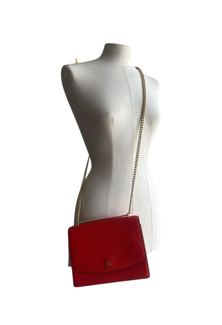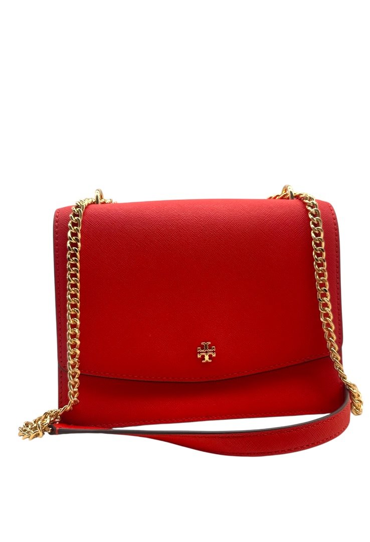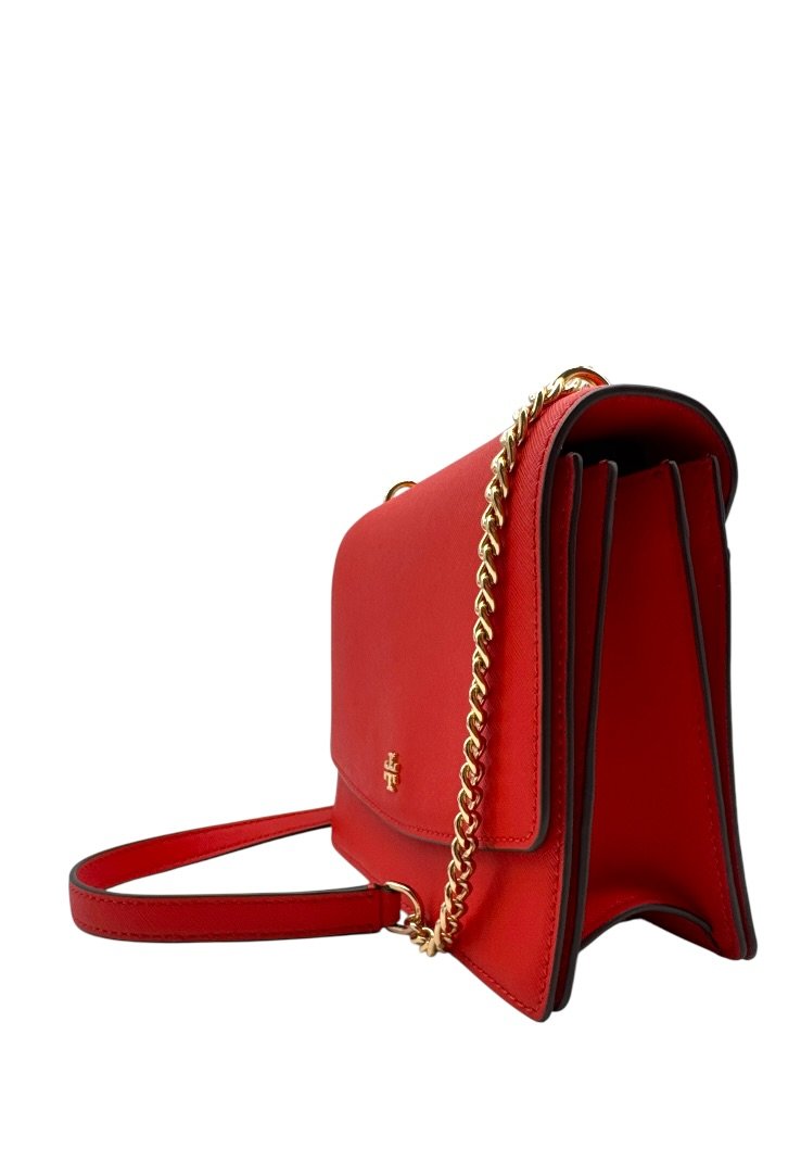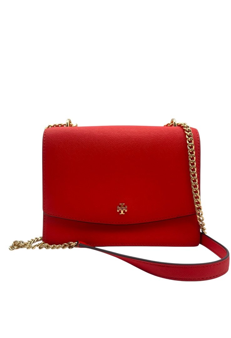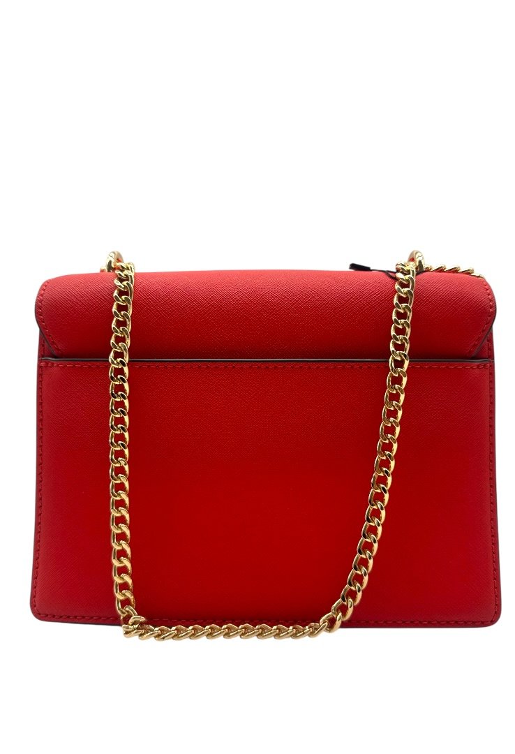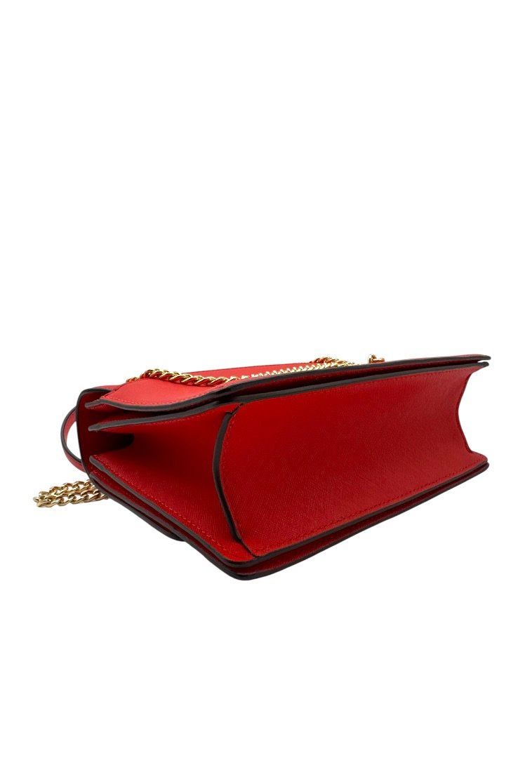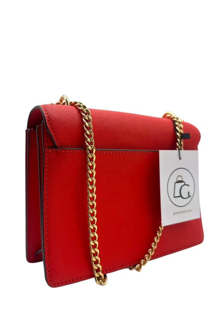 Bolsa elaborada en piel de curtidas, herrajes en dorado, asa de cadena, cierre en solapa con broche.