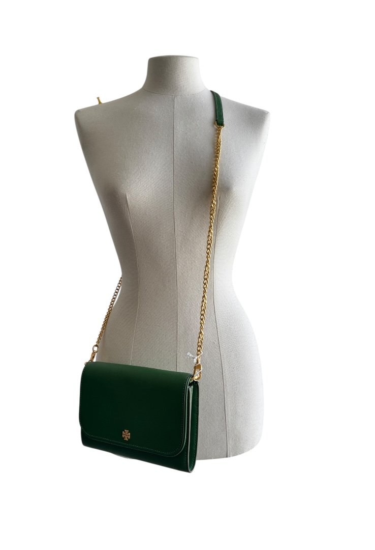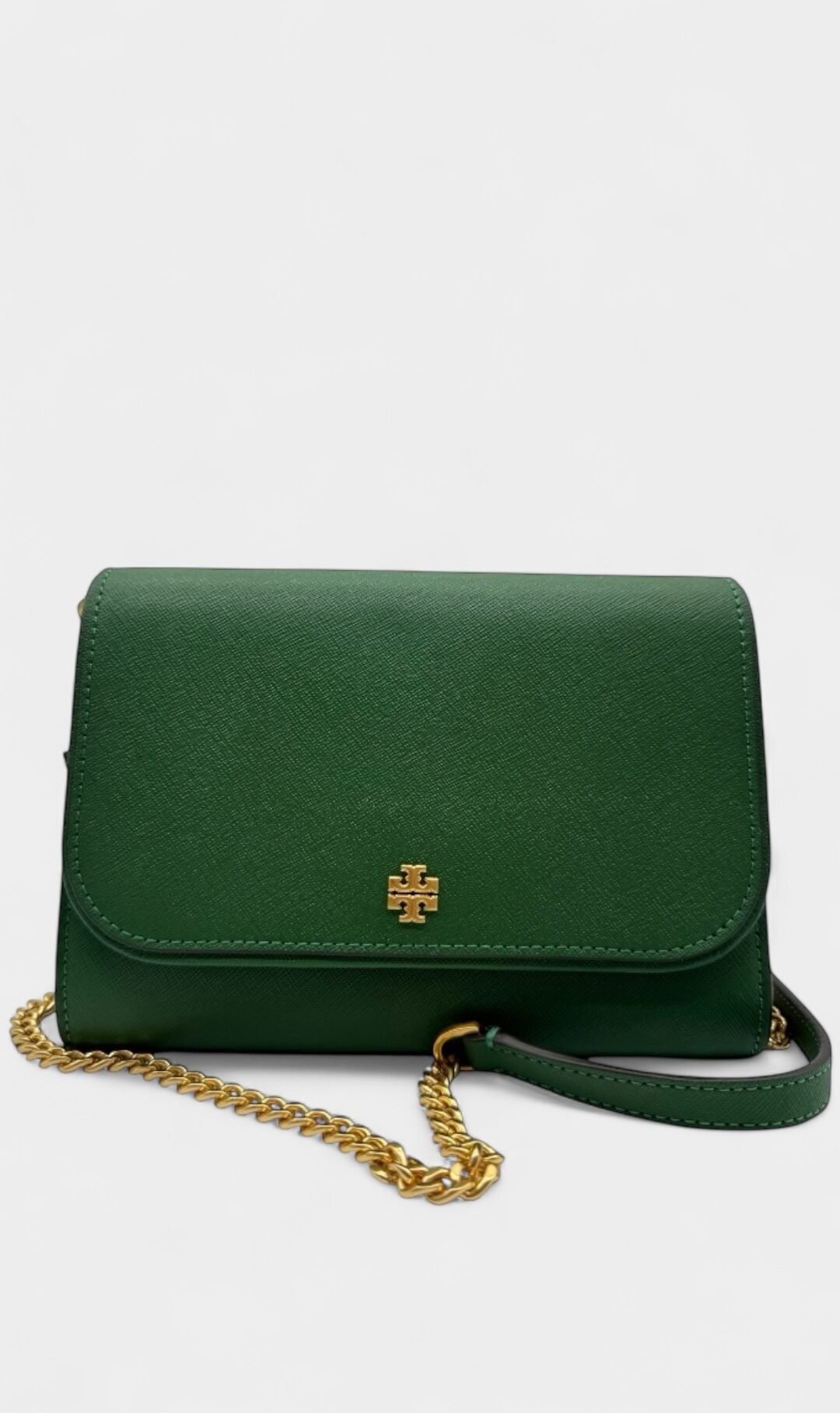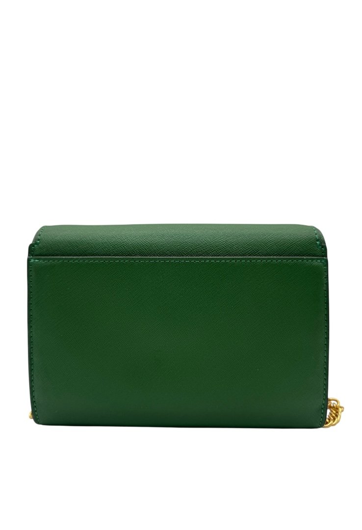 Elaborado en piel texturizada, con apliques en dorado, detalle de cadena en el asa, cierre en solapa con broche magnético.