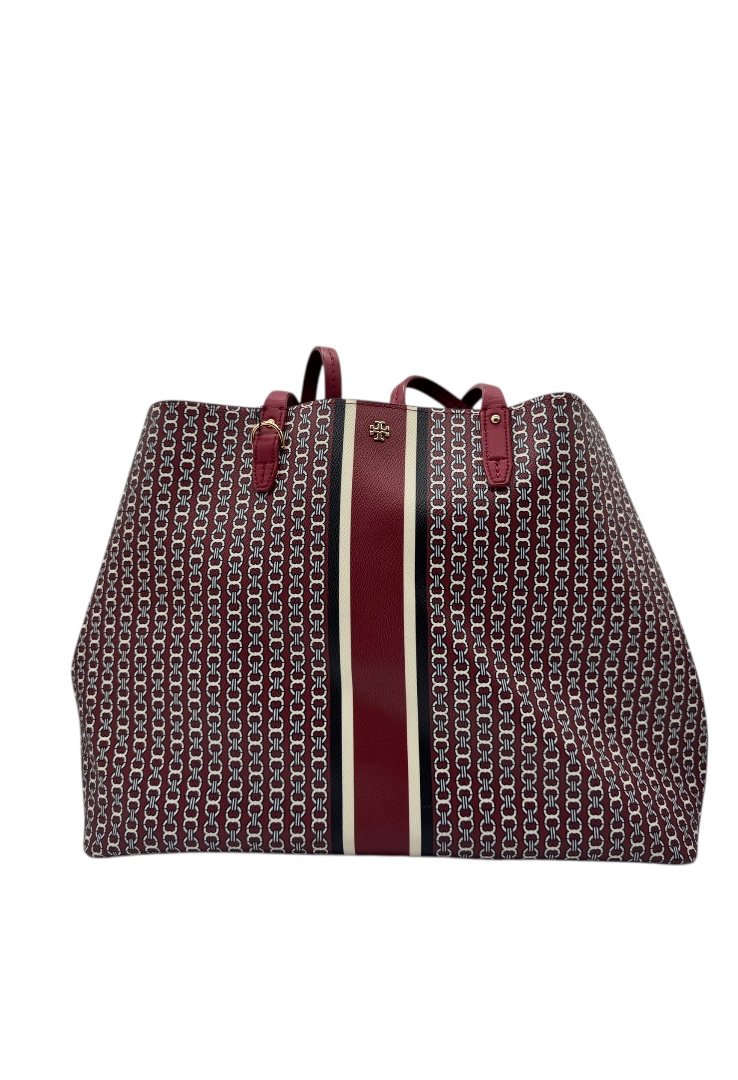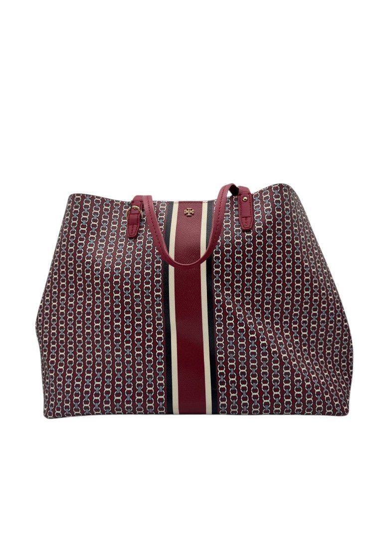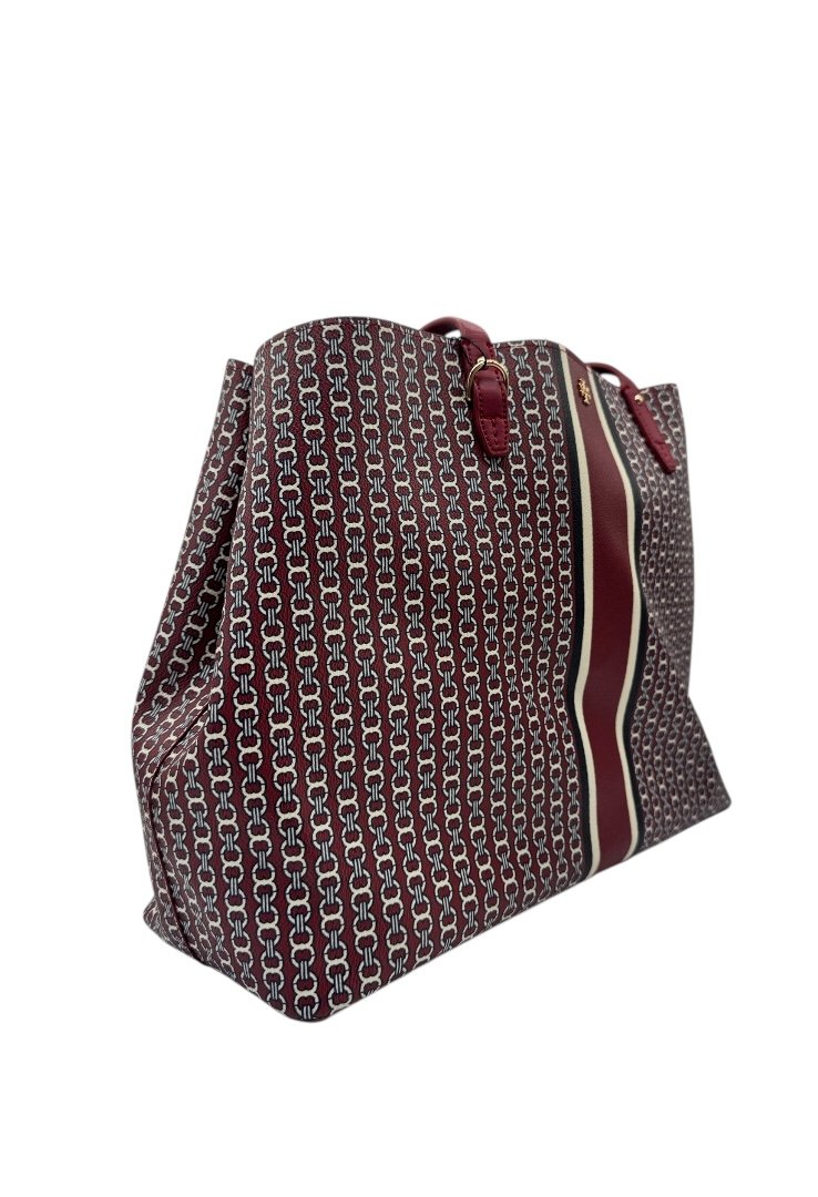 Bolsa elaborada en lona con diseño estilo cadena, apliques en dorado, broches en costado, cierre con botón magnético, compartimento interno cerrado.