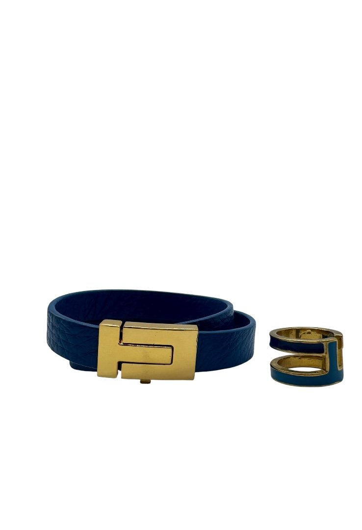 Pulsera de cuero con latón bañado en oro, y anillo de latón bañado en oro, esmalte en azul.