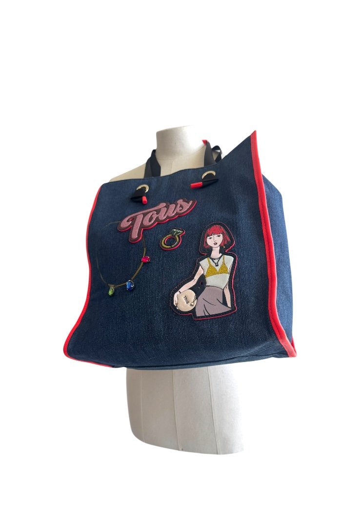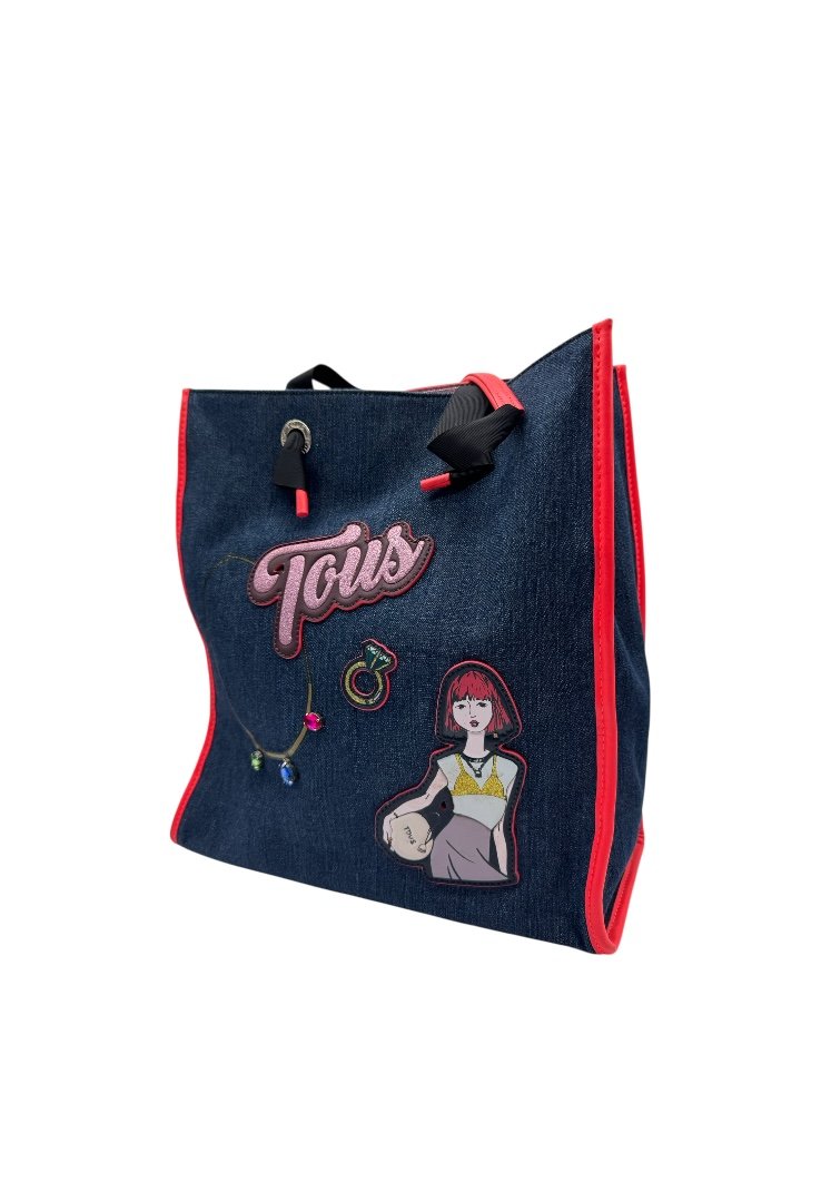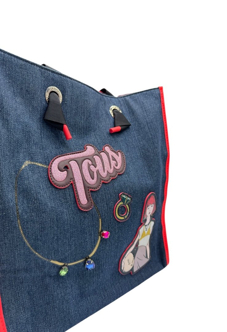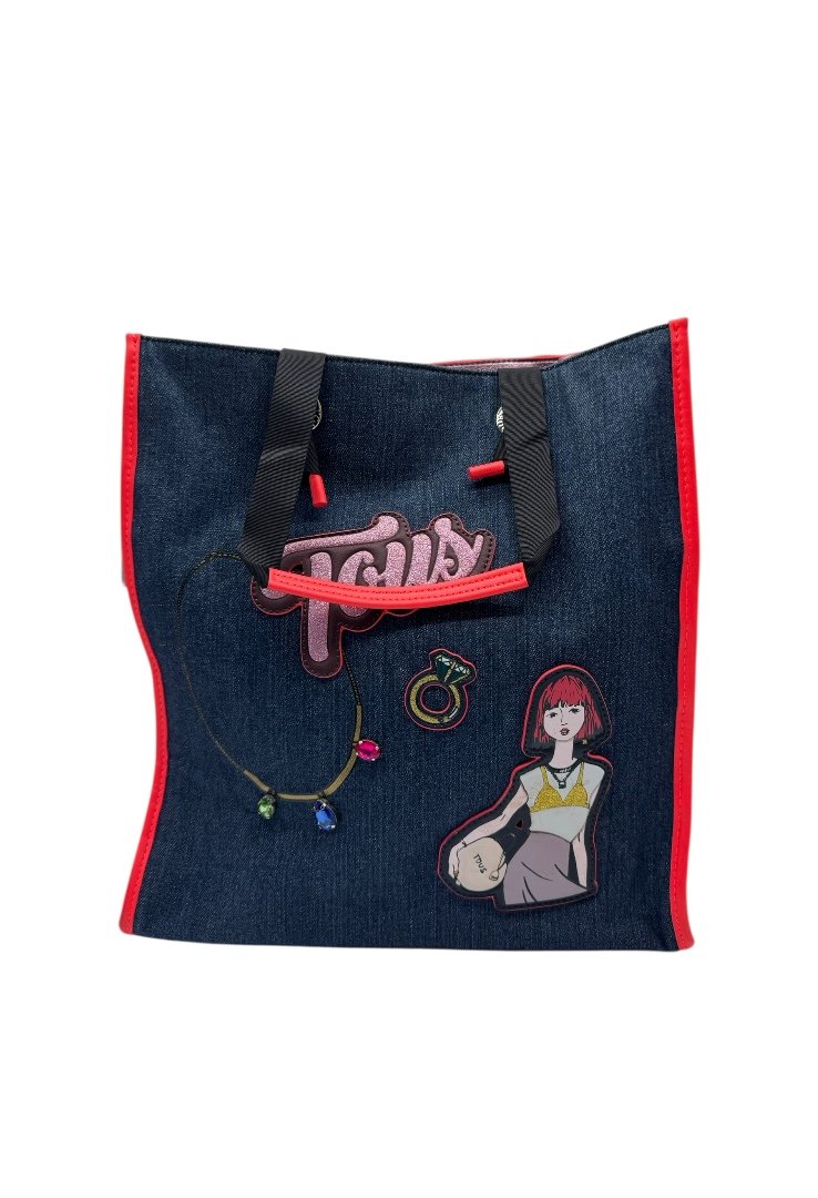 Bolsa shopping grande de tejido jeans combinado con vinilo, aplicaciones personalizados. Cierre con botón magnético y compartimento con cremallera, asas de hombro.