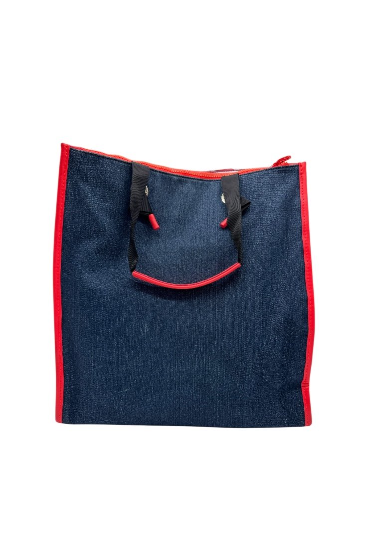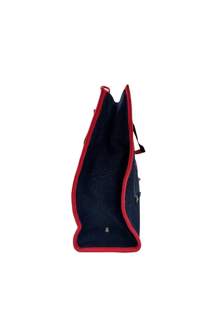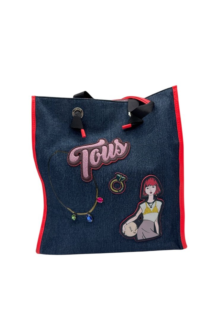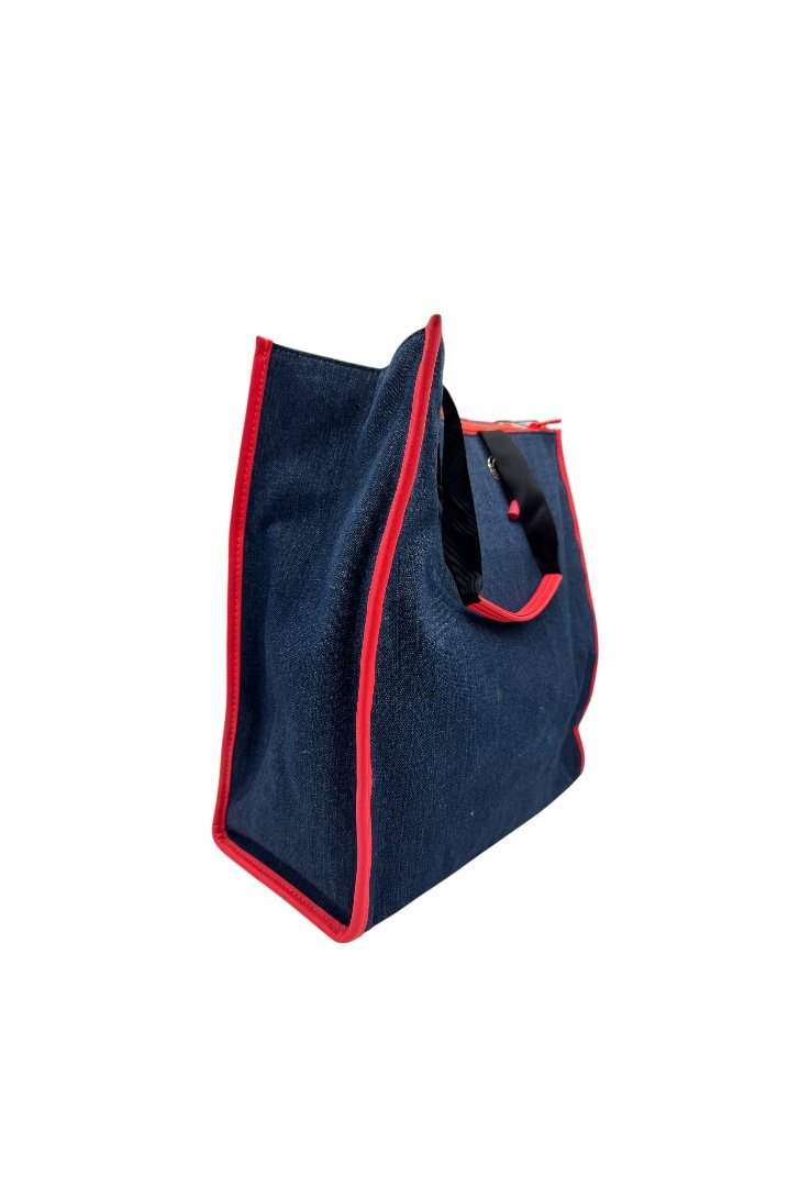 Bolsa shopping grande de tejido jeans combinado con vinilo, aplicaciones personalizados. Cierre con botón magnético y compartimento con cremallera, asas de hombro.