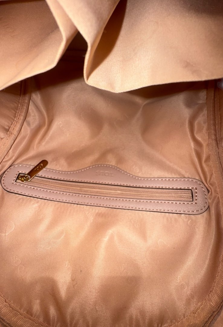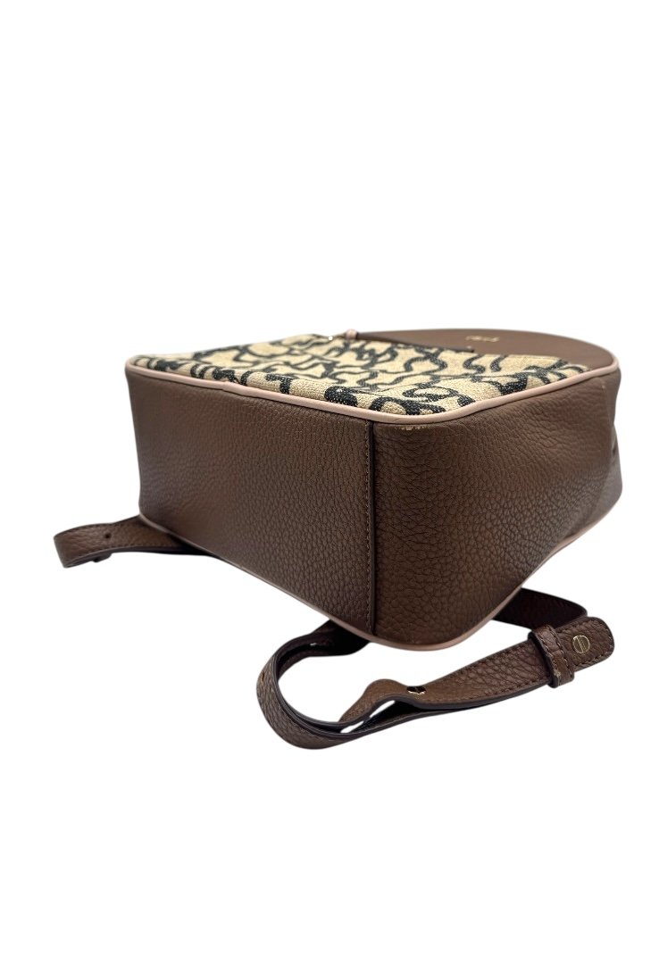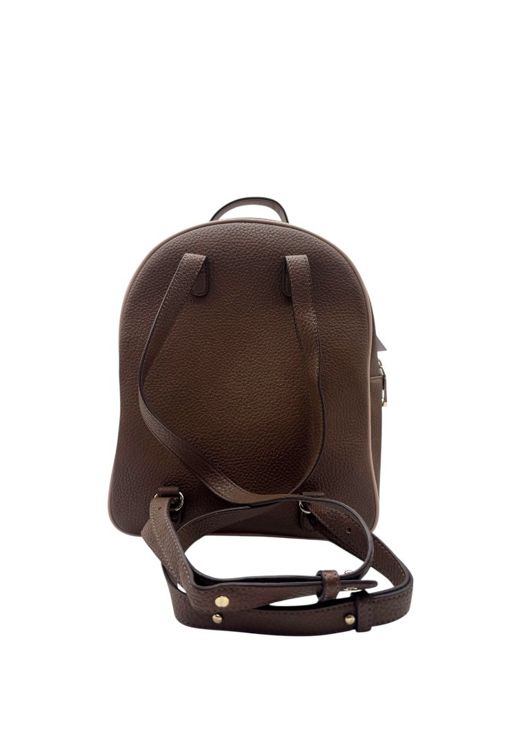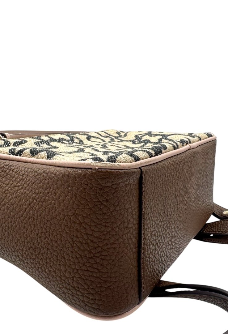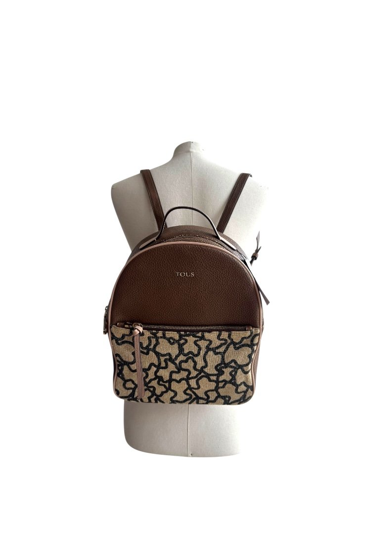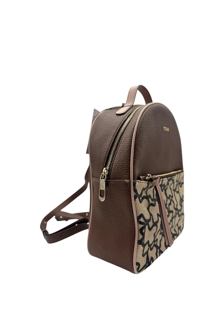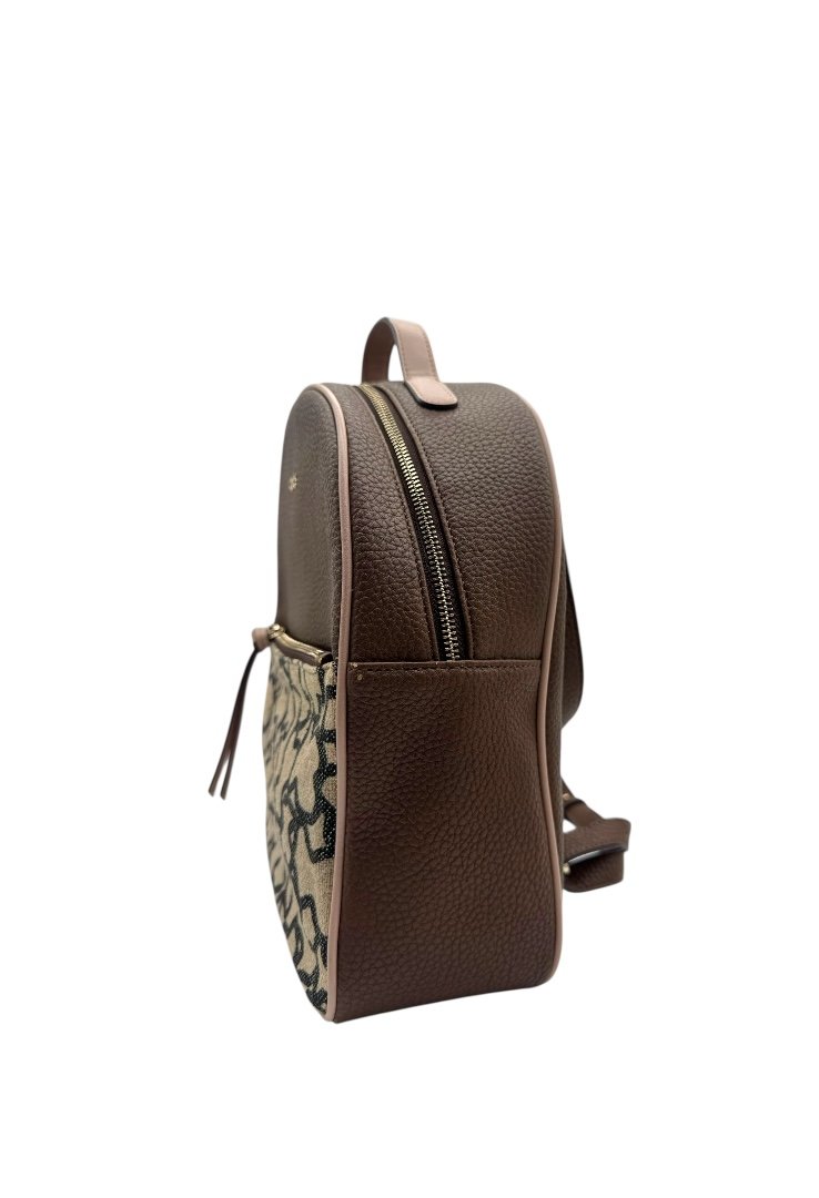 Mochila elaborada en piel granulada, detalles con diseño monogram, apliques en dorado, cierre en cremallera.