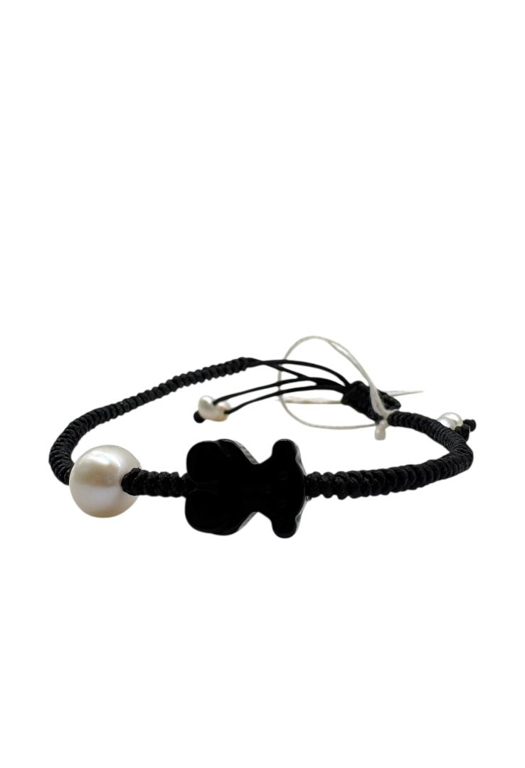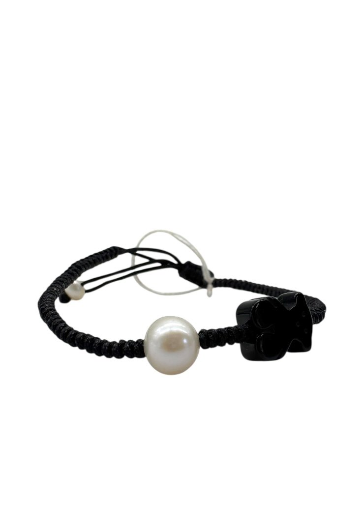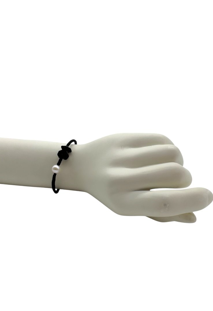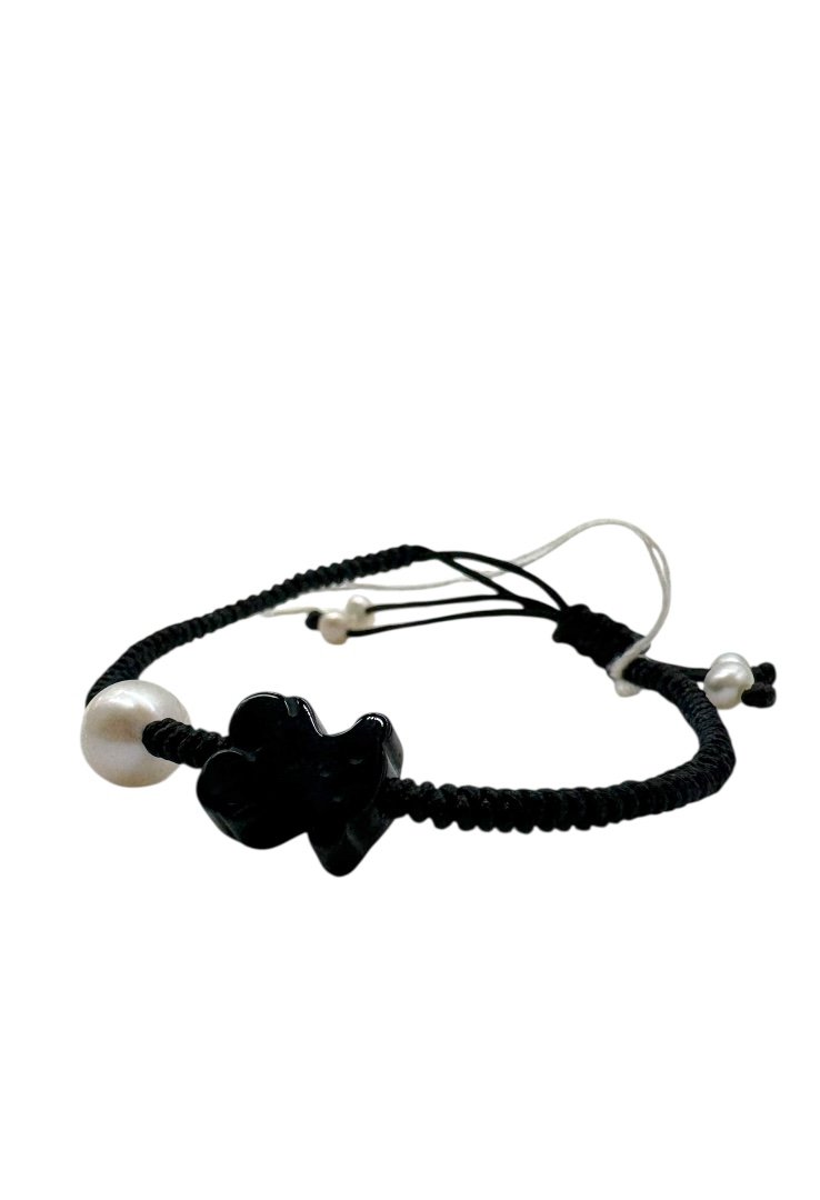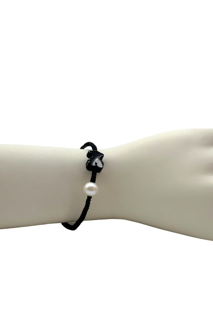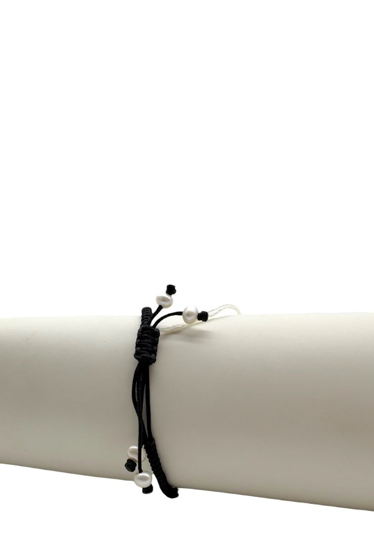 Pulcera eleborada en hilo encerado y perlas blancas, ajustable, con nudos deslizantes.