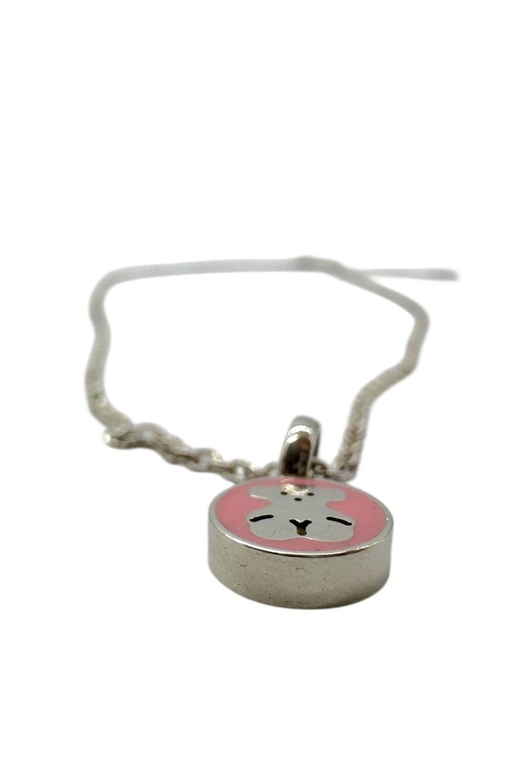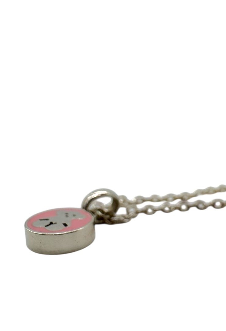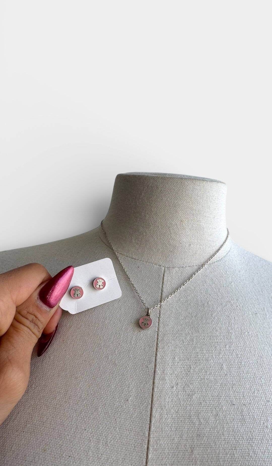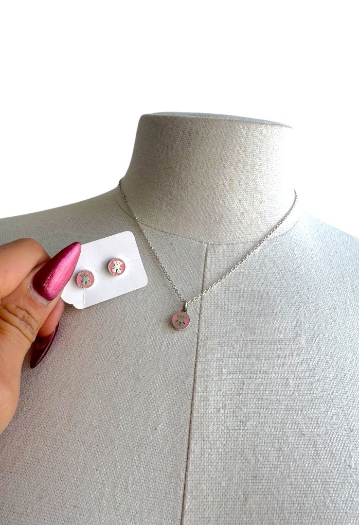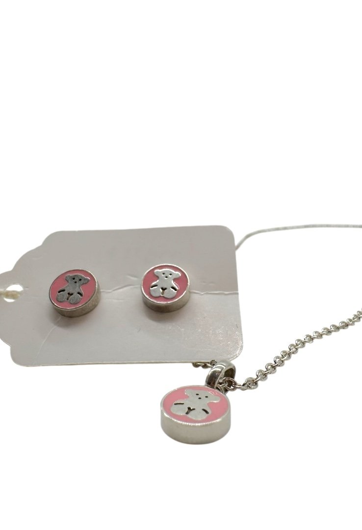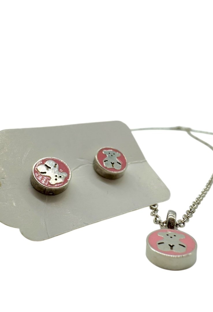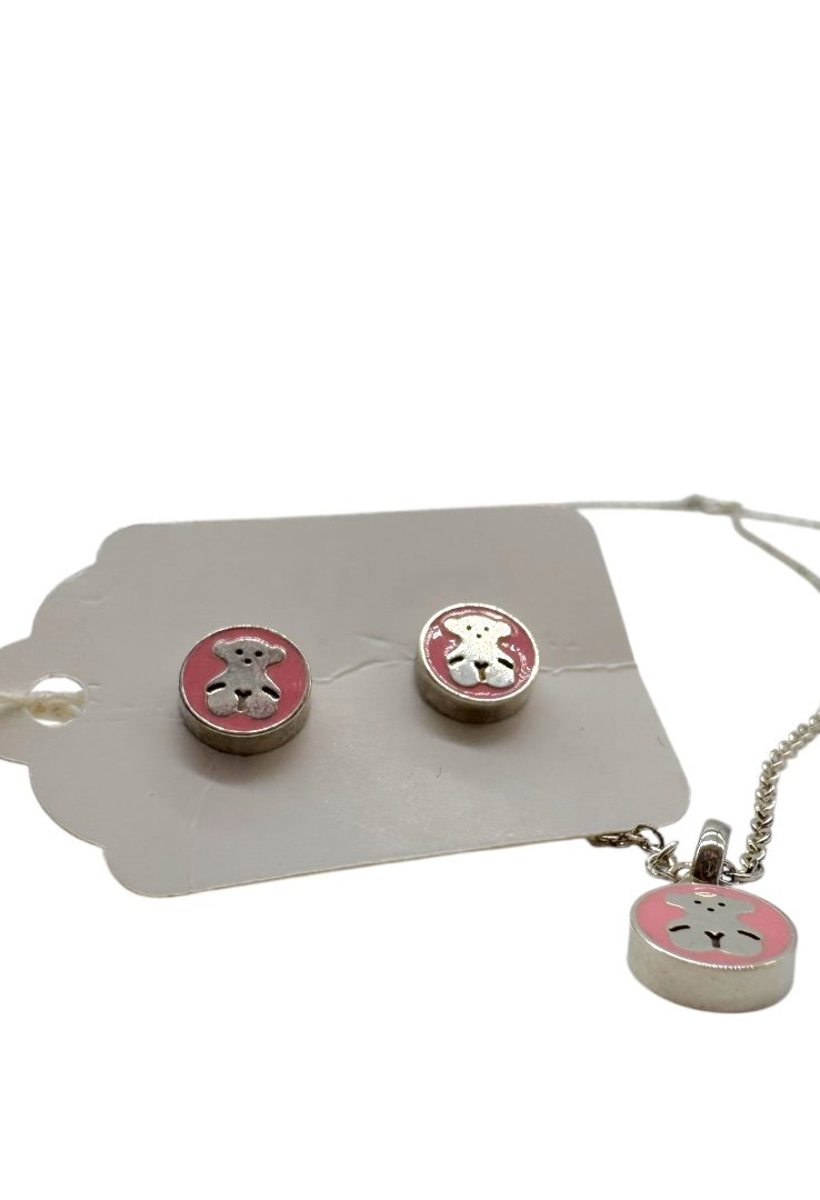 Aretes y collar de perlas, elaborado en plata y el emblematico osa de la marca.
