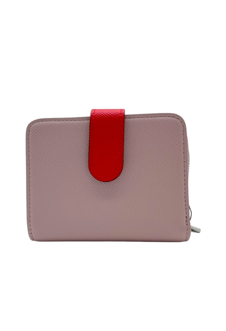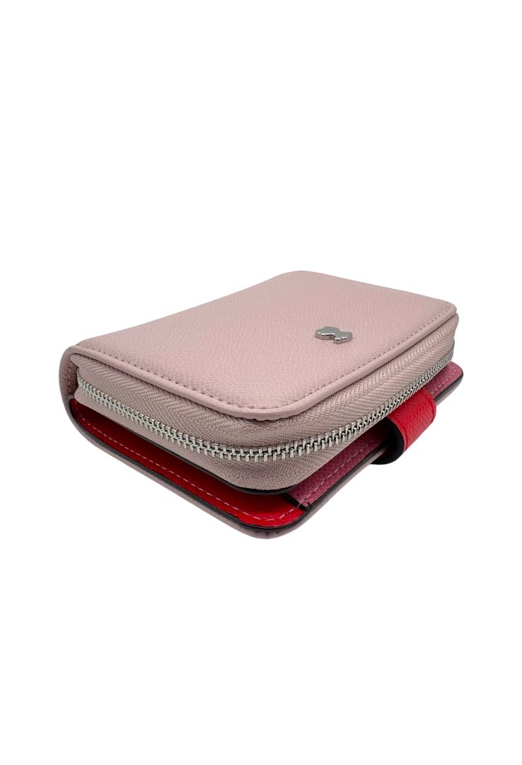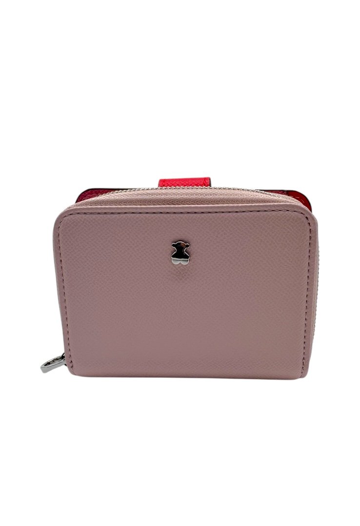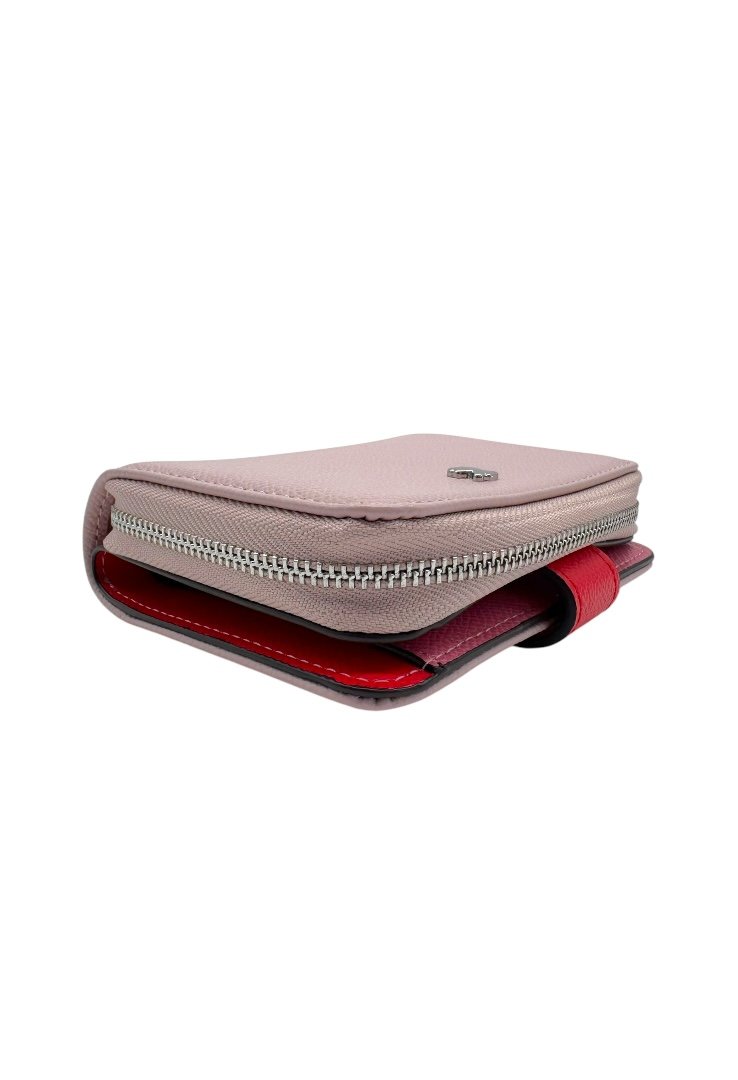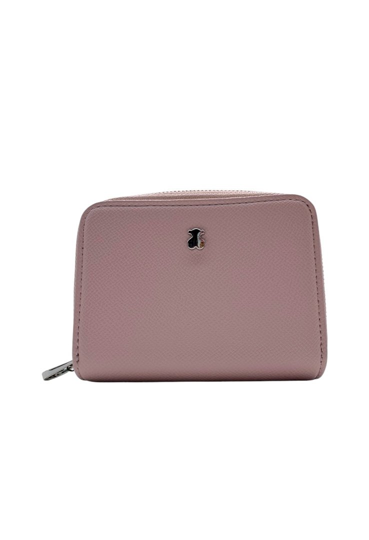 Cartera elaborada de poliuretano con efecto saffiano, compartimento con cierre de cremallera, segundo compartimento para tarjetas. Cierre de botón a presión.