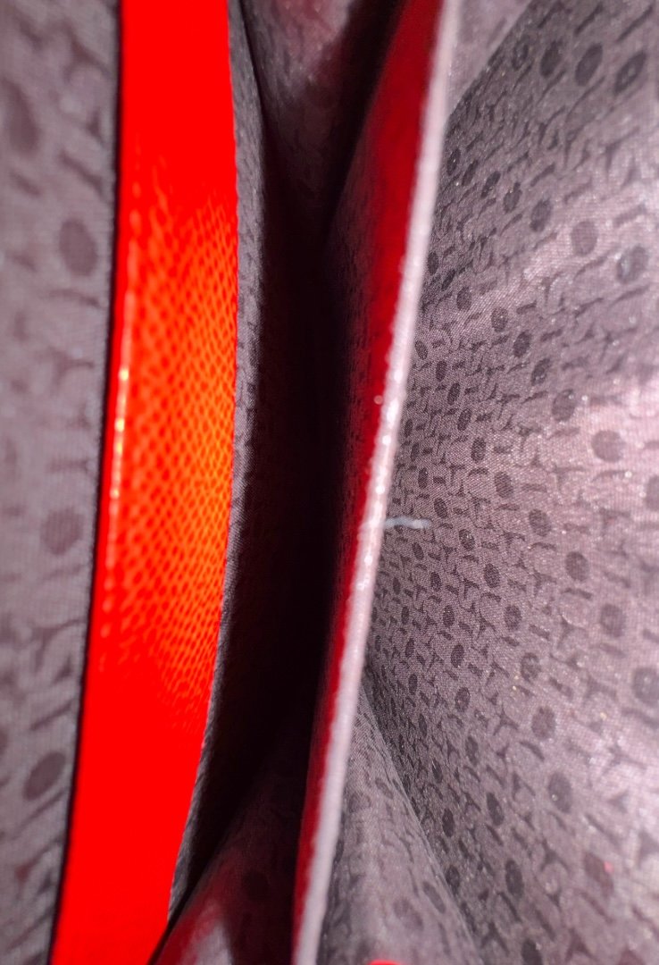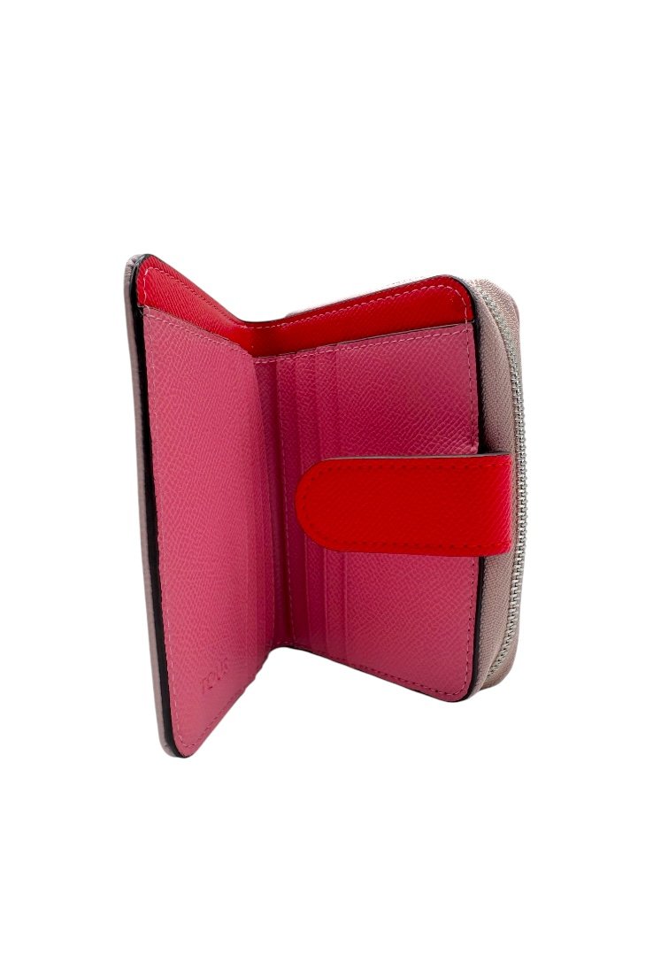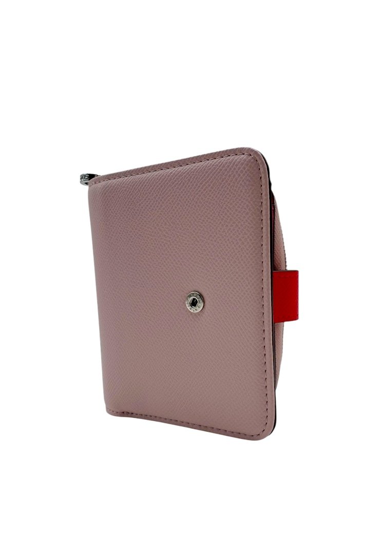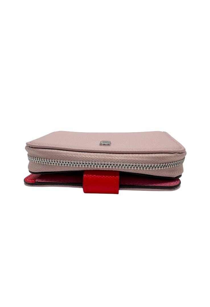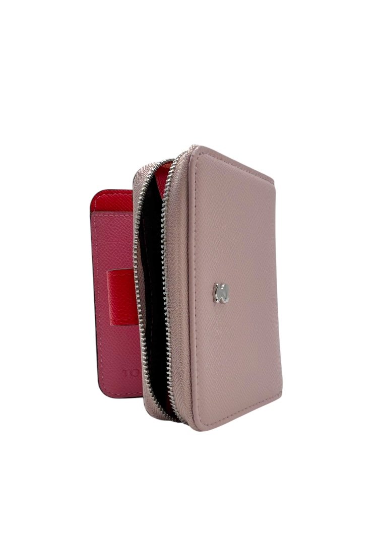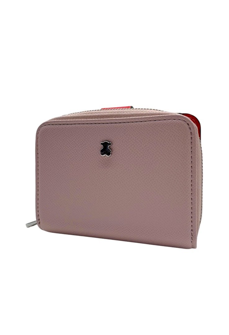 Cartera elaborada de poliuretano con efecto saffiano, compartimento con cierre de cremallera, segundo compartimento para tarjetas. Cierre de botón a presión.