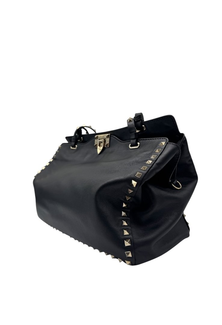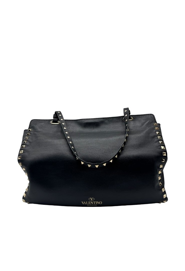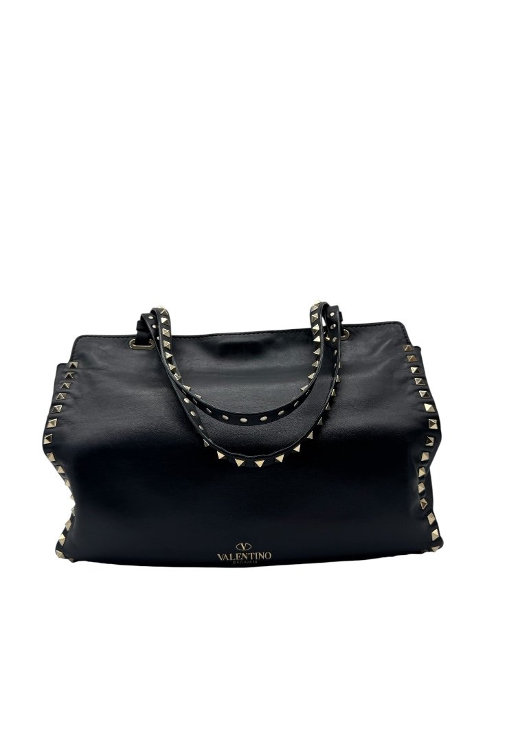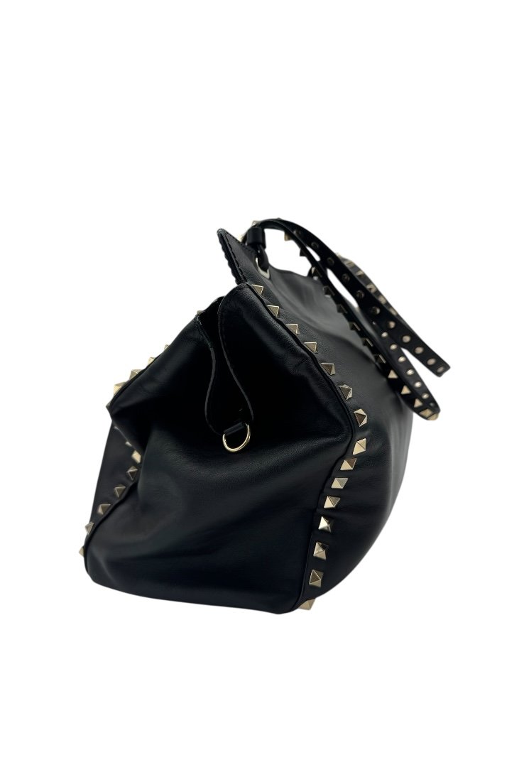 Bolsa elaborada de piel, con estoperoles y apliques en dorado.