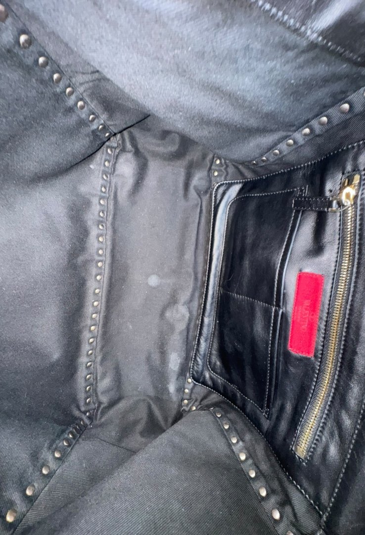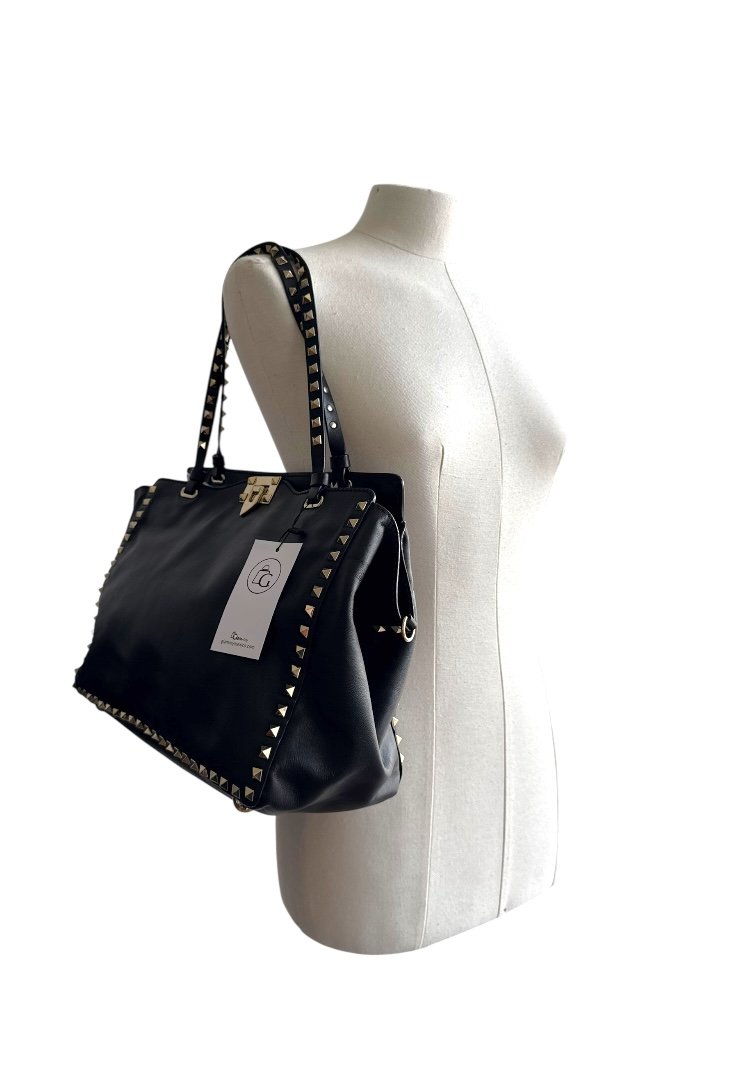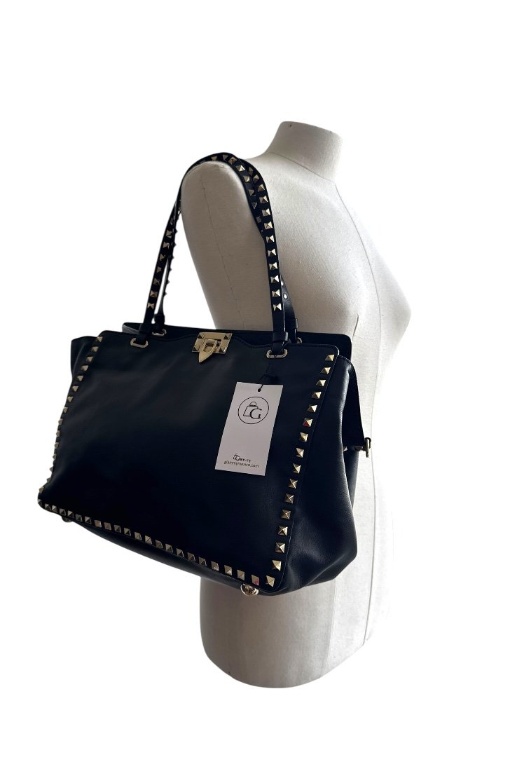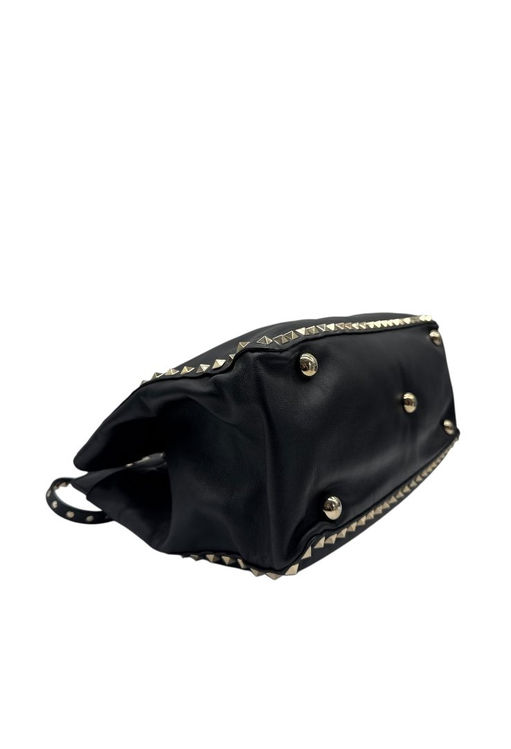 Bolsa elaborada de piel, con estoperoles y apliques en dorado.