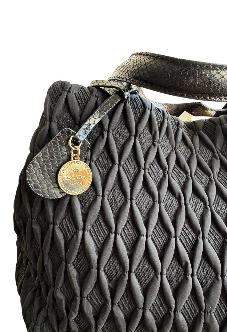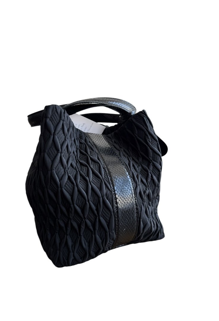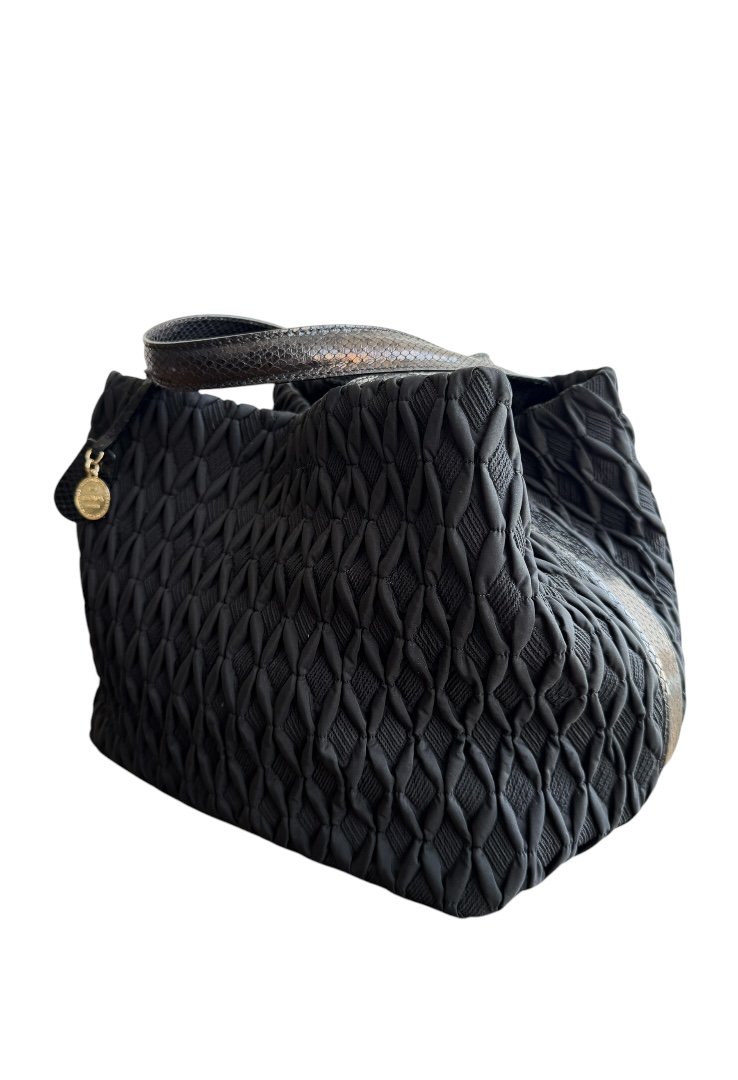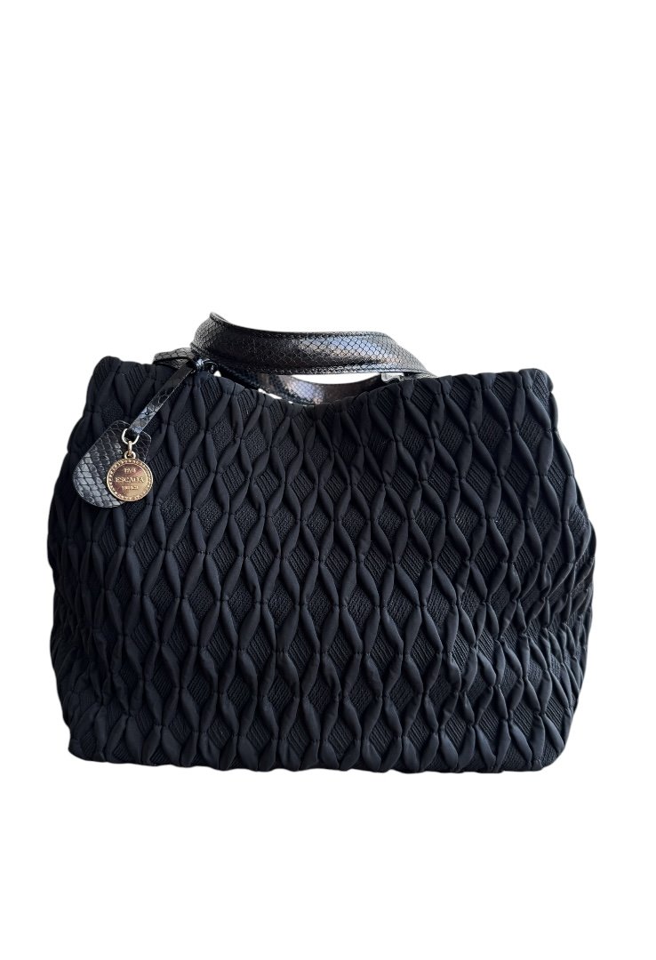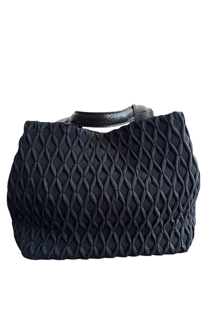 Bolso de hombro en tela, excelente espacio interior, doble cierre con gancho y botón.